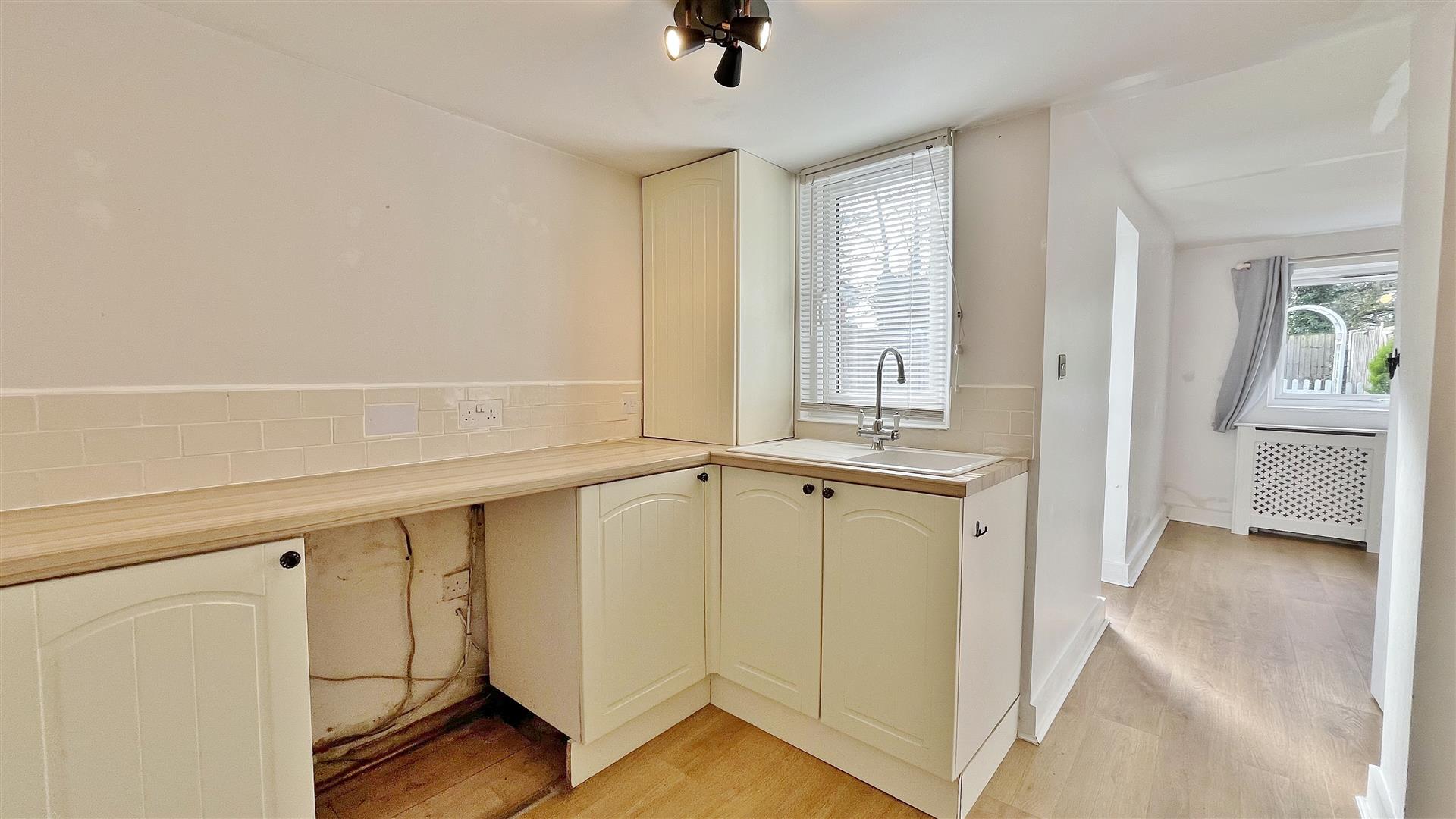 Fitted with a range of matching fronted units. Wood effect square edge worksurfaces. Inset ceramic sink bowl and drainer unit. Inset four ring electric hob with extractor hood above and electric oven under. Further selection of matching units at both eye and floor level. Space for fridge/freezer. Cupboard housing combination boiler. Tiled splash back. Wood effect laminate flooring. Sealed unit double glazed window to rear. Opening to:-