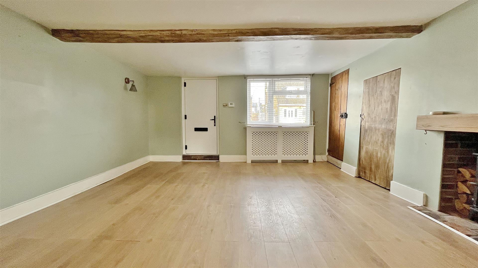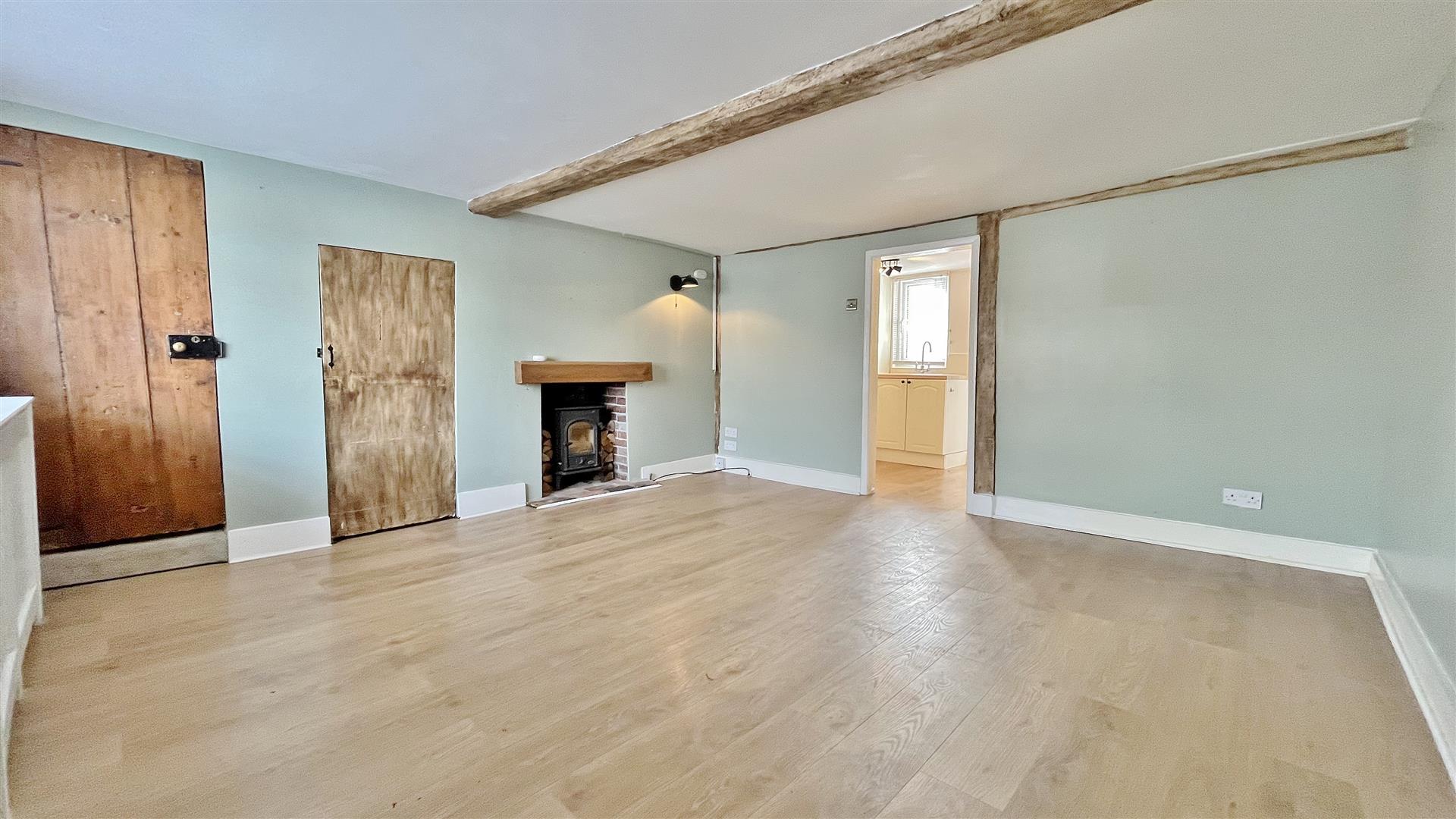 Wood effect laminate flooring. Log burner. Under stair storage cupboard. Stair flight to first floor. Radiator. Sealed unit double glazed window to front. Opening to:-