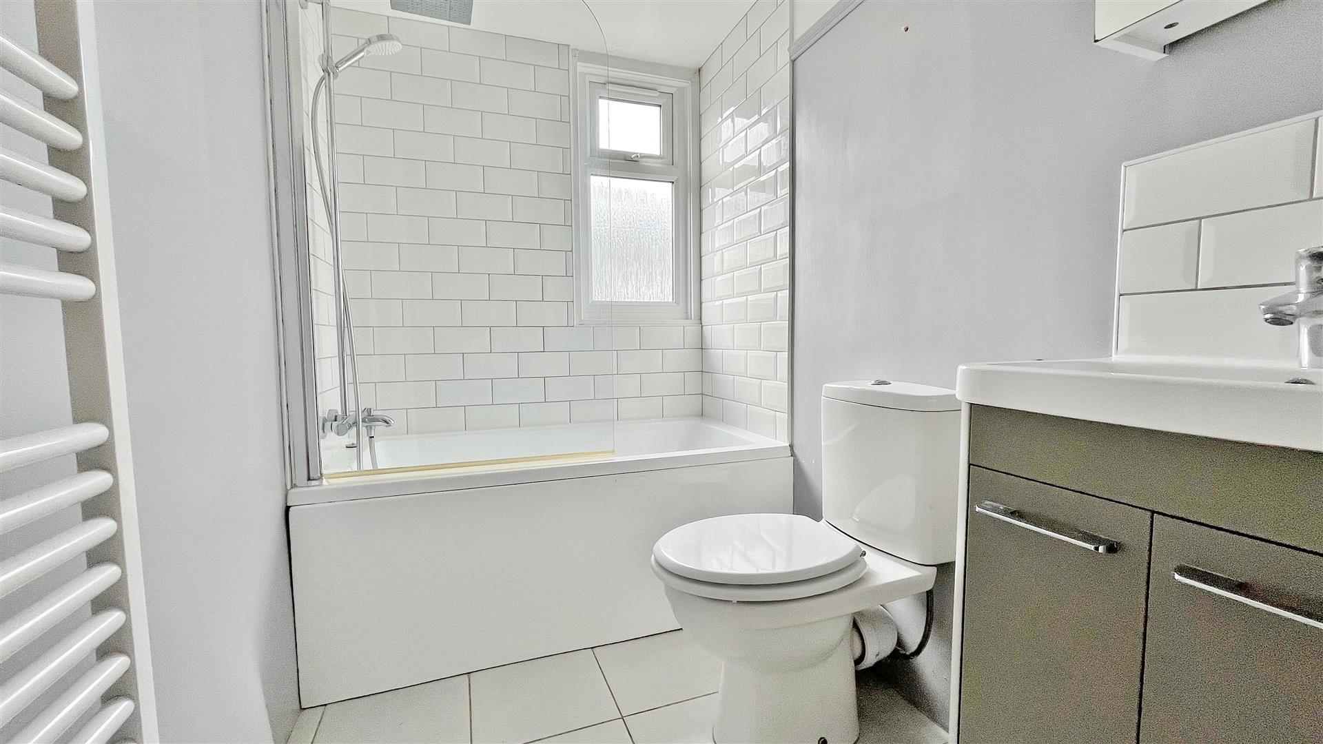 Modern suite comprises low level w/c. Vanity wash hand basin with storage cupboards under. Fitted panelled bath with wall mounted shower attachment. Heated towel rail. Part tiled walls. Tiled flooring. Obscured sealed unit double glazed window to rear.