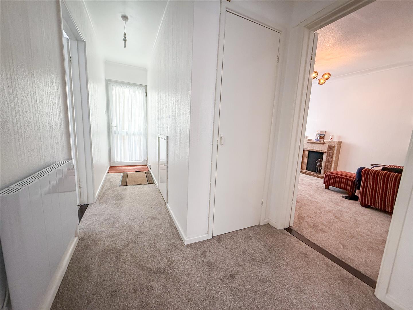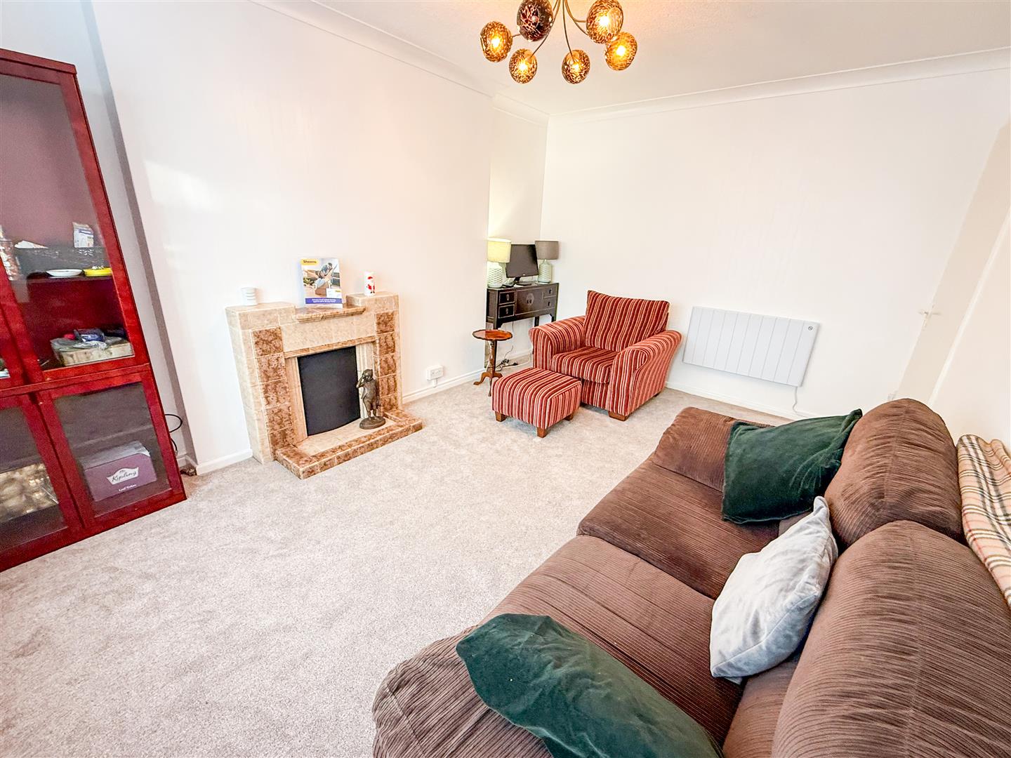 Feature tiled fireplace. Wall mounted modern electric wall mounted radiator (not tested). Recently carpeted. Double glazed window to front.