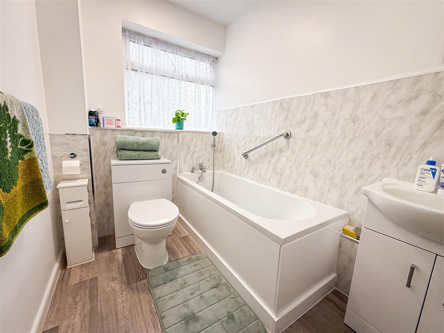 Recently fitted with a modern white three piece bathroom suite comprising panelled bath. Vanity wash hand basin with cupboards below. Low level W.C. Tiled splashbacks. Double glazed window to side.