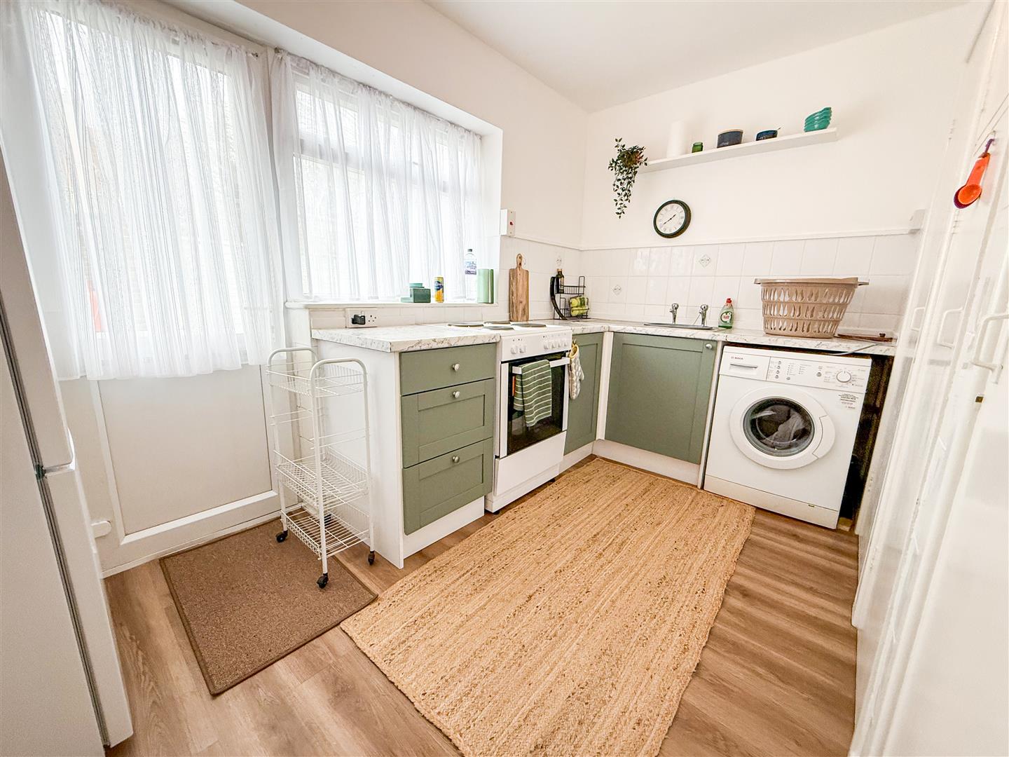 Fitted with a range of sage green matte panelled laminate fronted units comprising white marble effect laminated rolled edge work surfaces with cupboards and drawers below. Inset single drainer stainless steel sink unit. Cooker space. Space and plumbing for washing machine. Built in larder cupboard. High level built in cupboard housing water tank. Additional built in cupboard. Tiled splashbacks. Wood effect flooring. Double glazed window to rear. Double glazed door to rear garden.