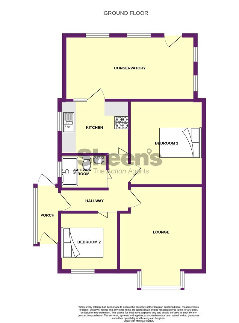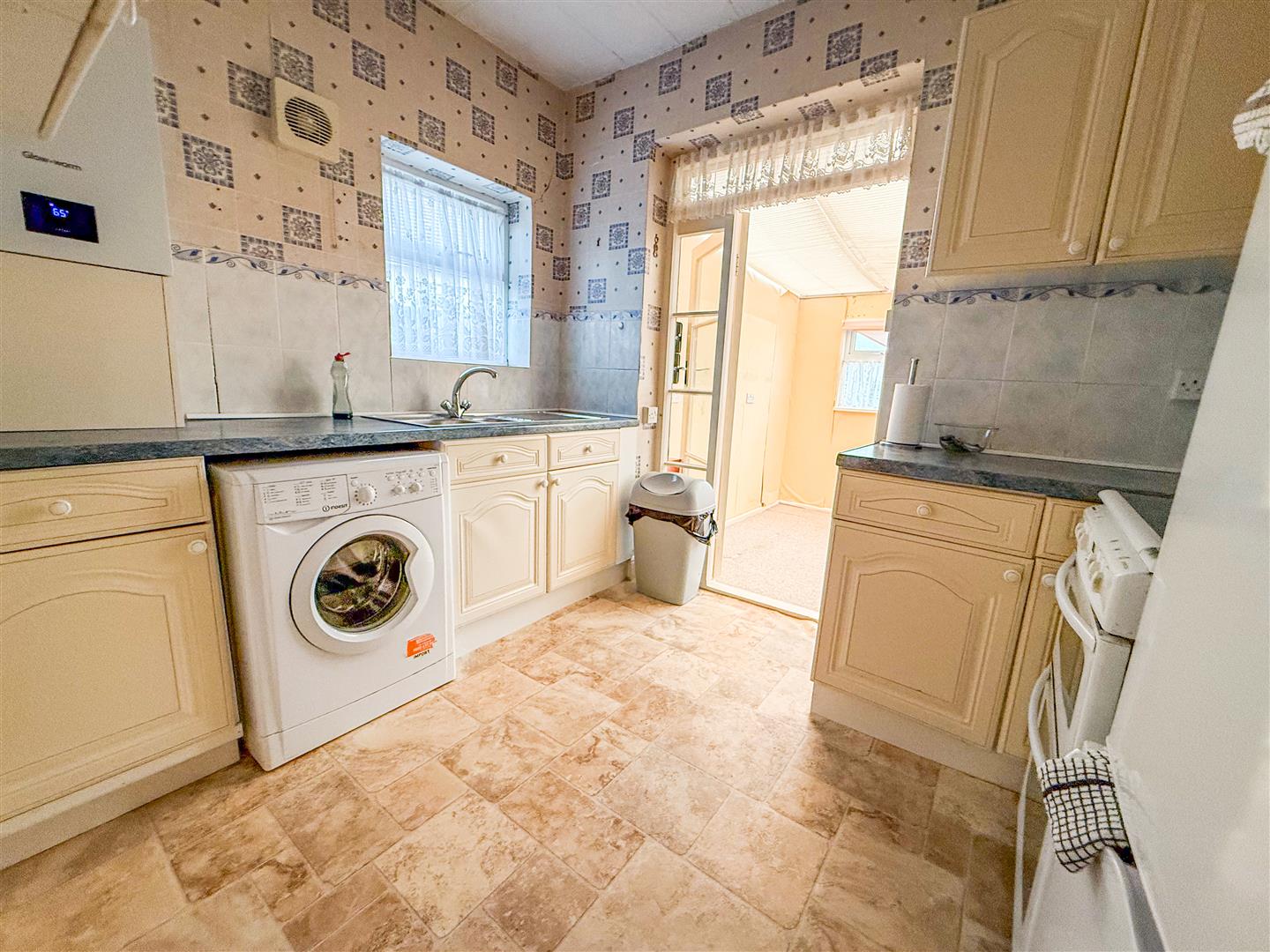 Fitted with a range of laminate panel fronted units. Comprises laminated rolled edge work surfaces with cupboards and drawers below. Range of matching wall mounted units. Inset one and a half bowl single drainer stainless steel sink unit with mixer tap. Cooker space. Space and plumbing for washing machine. Tall fridge/freezer space. Tiled splash backs. Radiator. Wall mounted gas boiler (not tested). Double glazed window to side. Single glazed window and internal door to Sun Lounge.