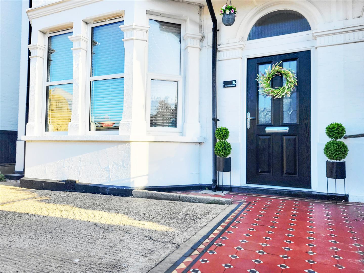 Period encaustic tiled pathway leading to front door. Hardstanding area providing off street parking for numerous vehicles. Gate gives side pedestrian access to: