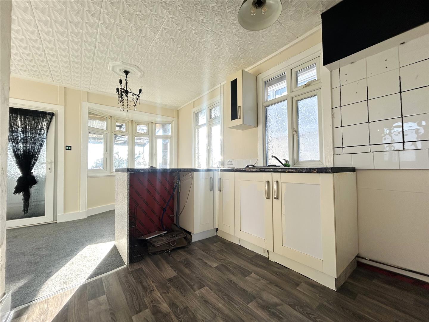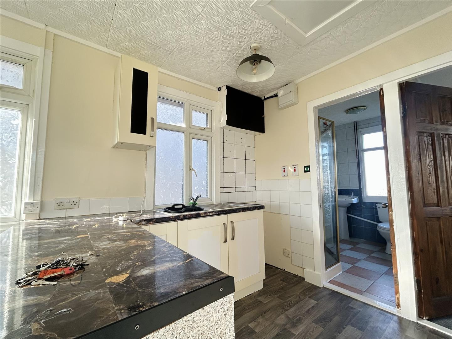 New Vinyl flooring, cupboard's at both eye and floor level. Space for freestanding cooker. Part tiled walls.