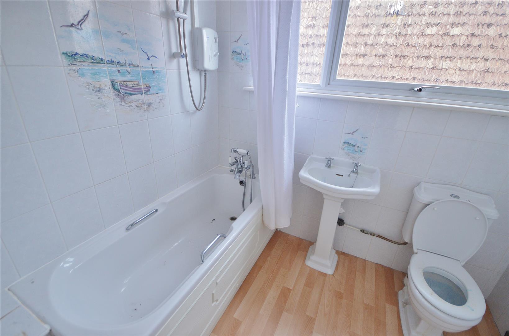 Three piece white suite comprising low level W.C. Pedestal hand wash sink basin. Panelled bath with wall mounted electric shower and shower head attachment above (not tested). Fully tiled. Heated towel rail. Double glazed window to side.