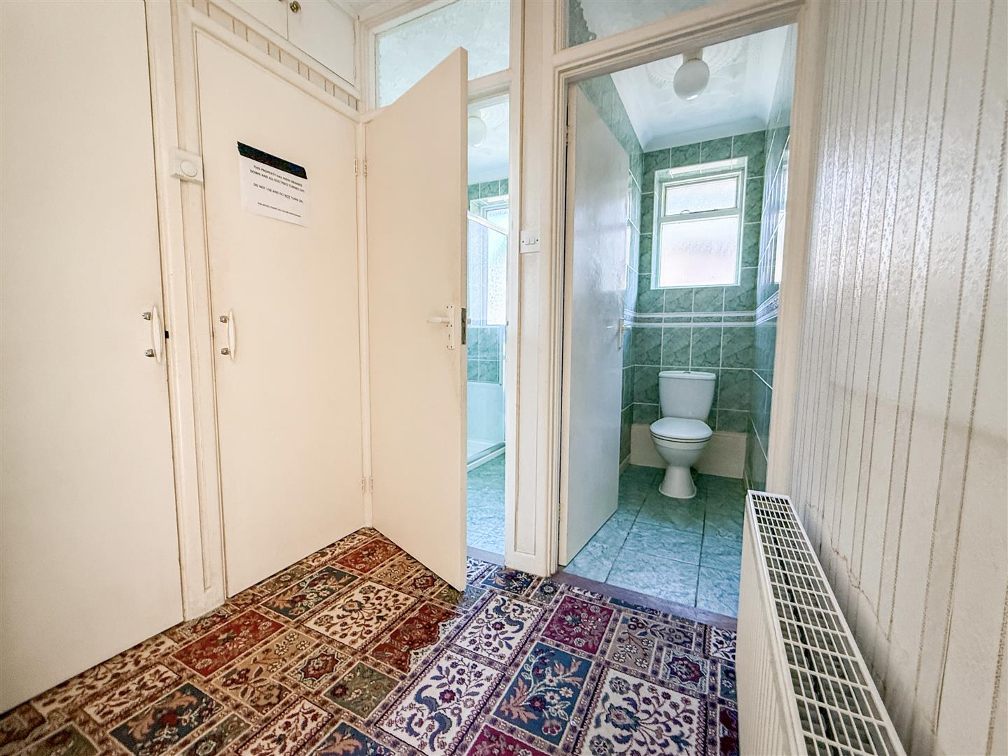 Radiator. Built in airing cupboard housing hot water cylinder (not tested). Additional built in cupboard housing wall mounted gas boiler. Doors to: