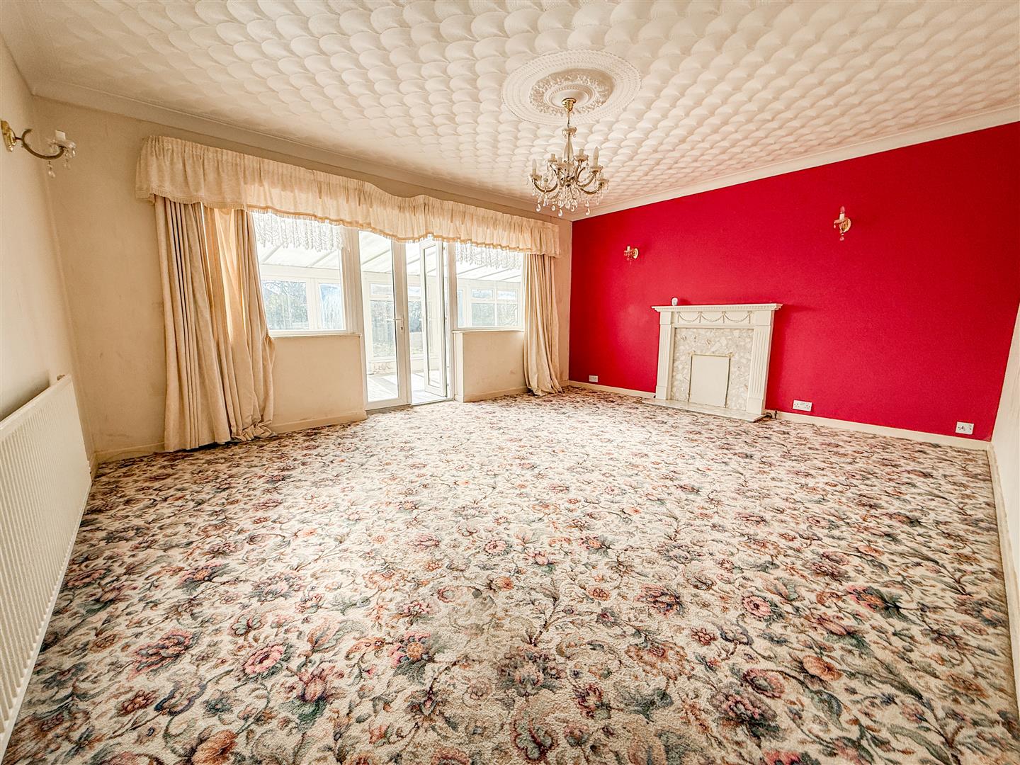 Radiator. Ornamental fire surround. Single glazed windows to conservatory. Double glazed French style doors to conservatory.