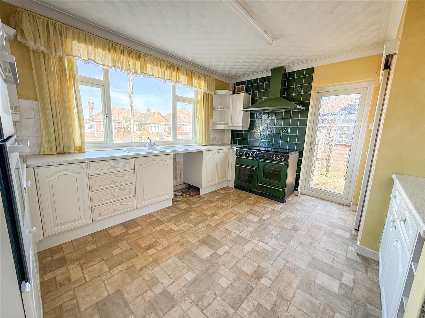 Fitted with a range of white laminate panel fronted units with grey key line trim. Comprises laminated rolled edge work surfaces with cupboards and drawers below. Range of matching wall mounted units incorporating part glass fronted display cabinets. Inset one and a half bowl single drainer sink unit with mixer tap. Range cooker space with fitted range extractor hood above. Additional built in high level double electric oven (not tested). Built in larder cupboard with single glazed window to side. Space and plumbing for washing machine. Tiled splash backs. Double glazed window to front. Double glazed door to side.