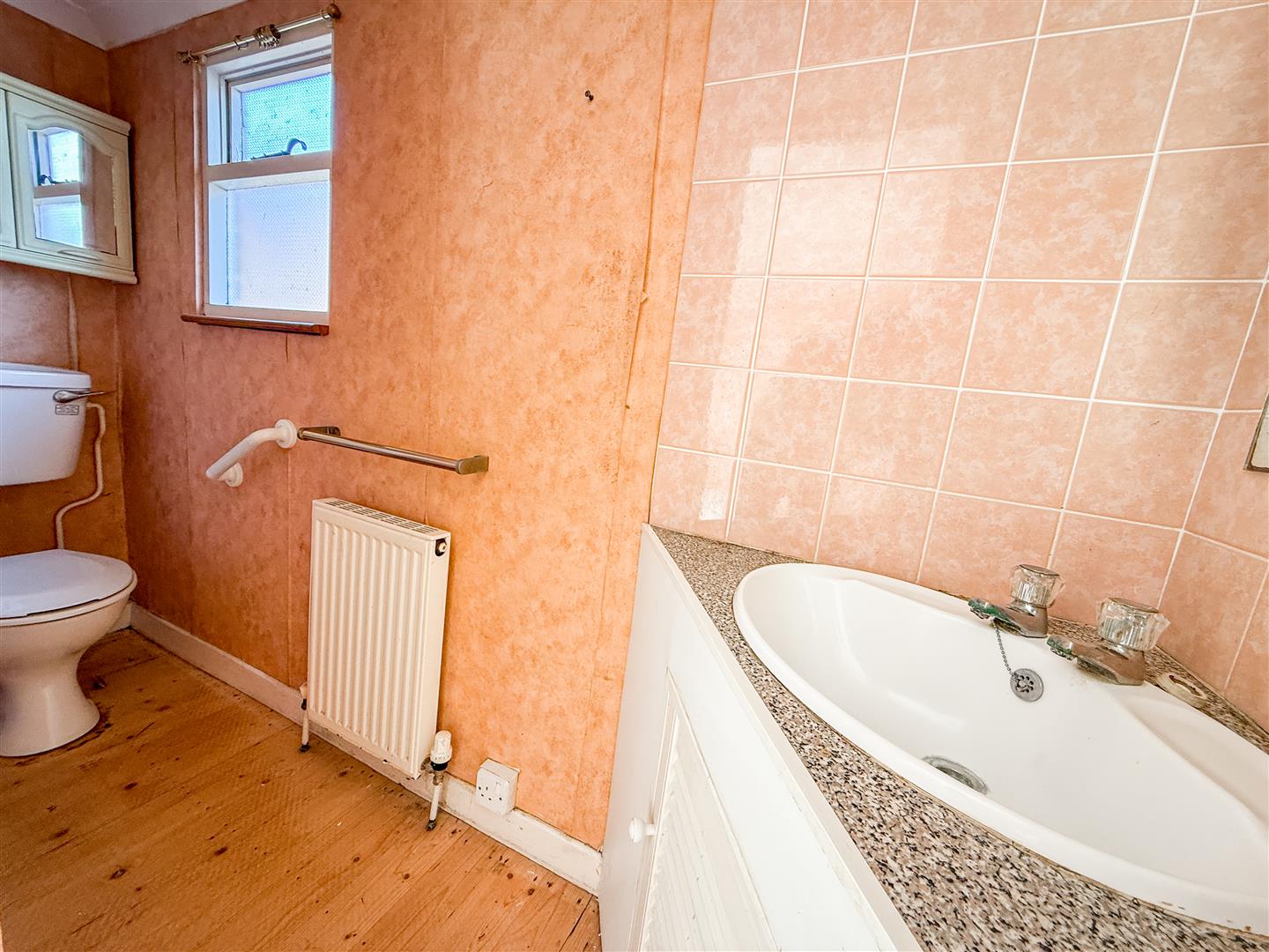 Fitted with a white suite comprising low level W.C. Vanity wash hand basin with cupboard below. Radiator. Single glazed window to side.