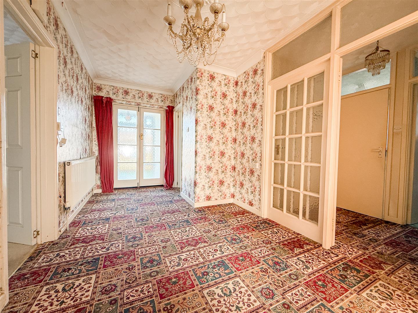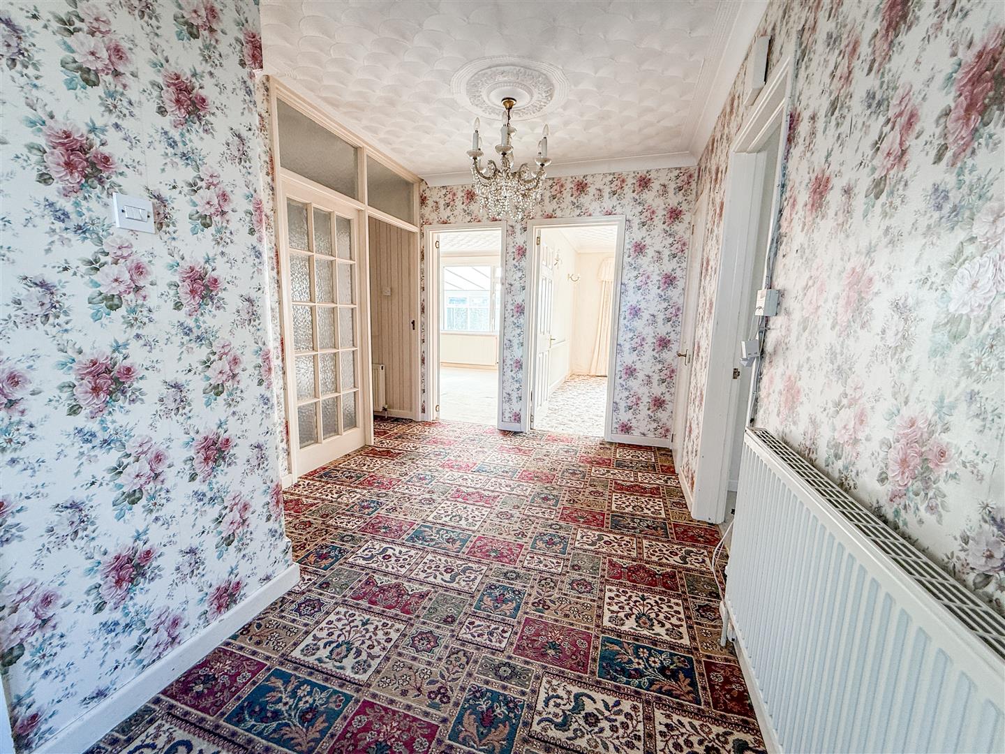 Radiator. Walk in storage cupboard. Multi panelled glazed door and dividing panel to inner hallway. Doors to:
