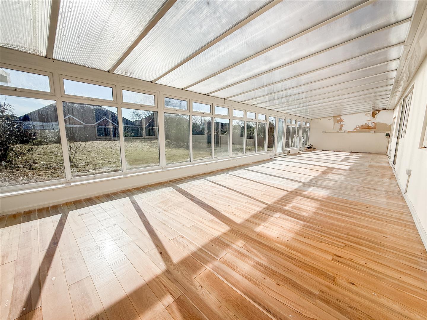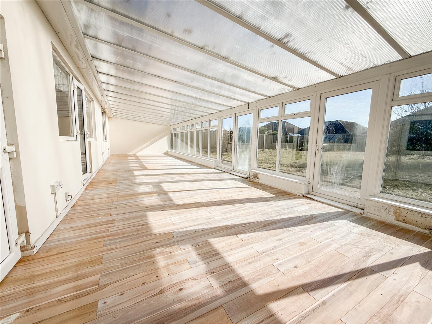 Part brick built with double glazed windows to rear overlooking garden. Poly-carbonate roof. Double glazed door to garden. Double glazed double doors to rear garden. Double glazed door to double length Garage.