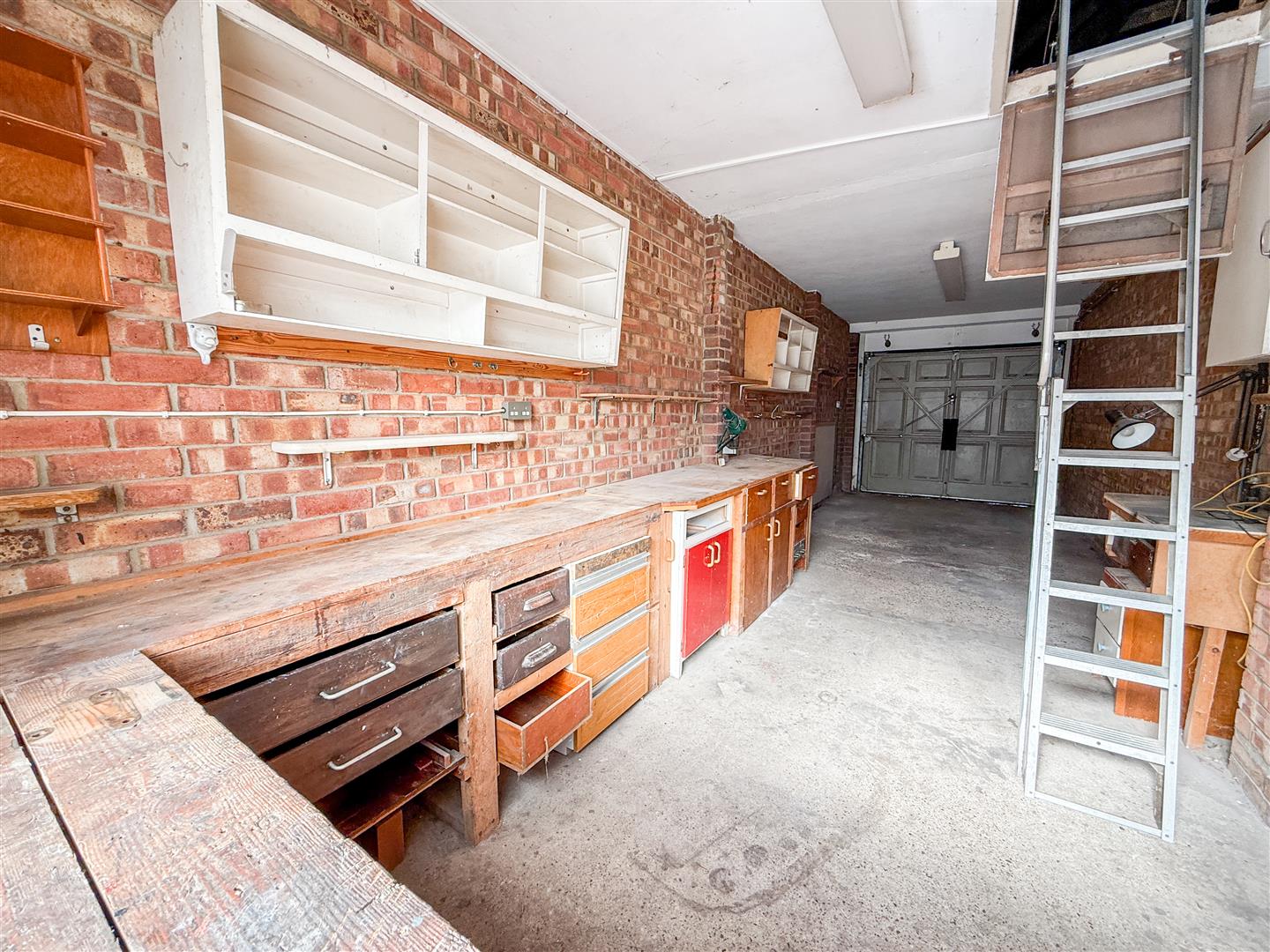 Access via up and over door. Power and light connected. Loft access with pull down loft ladder. Array of fitted work benches.