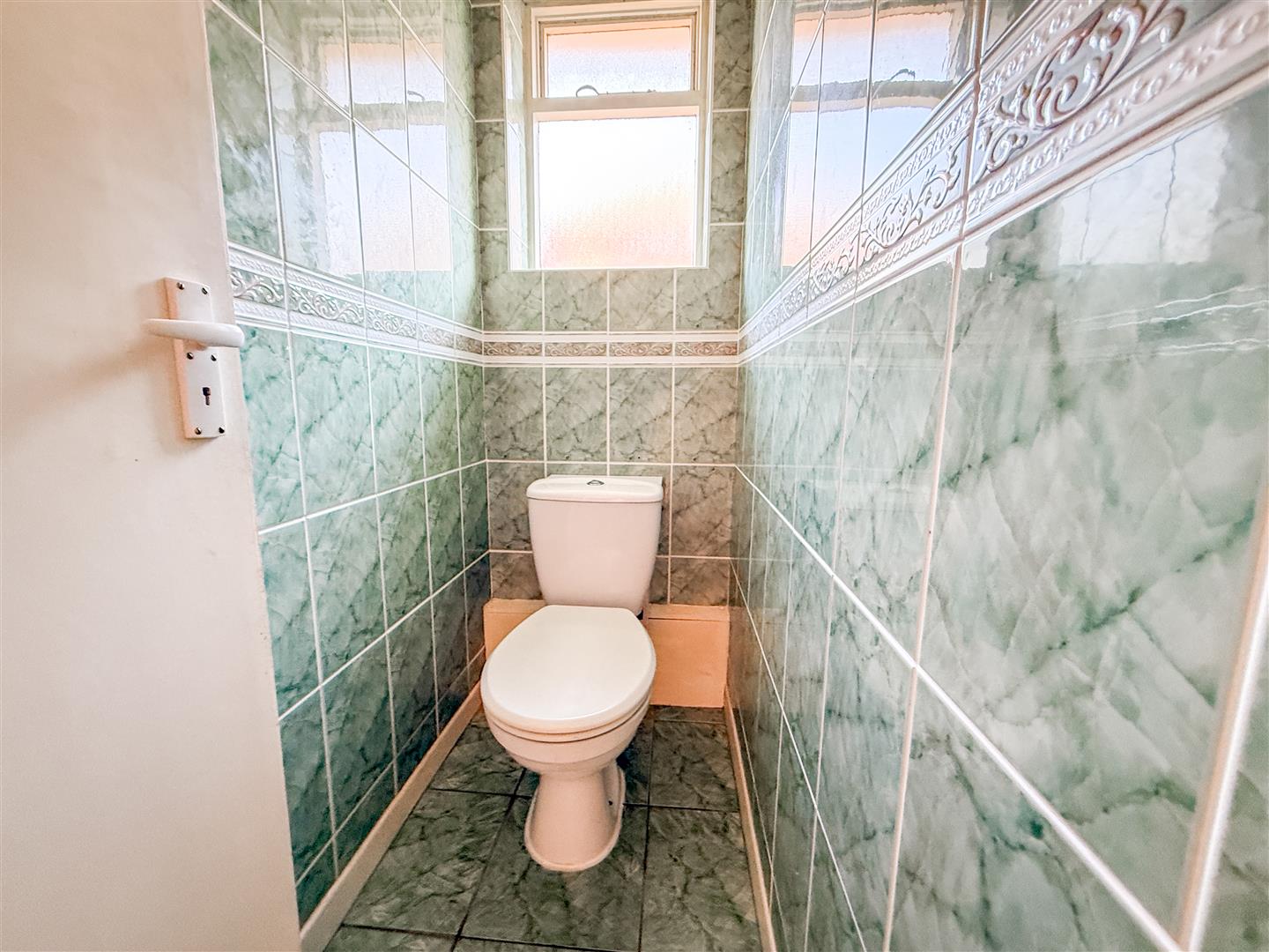 Fitted with a White suite comprises low level W.C. Fully tiled walls. Tiled flooring. Single glazed window to side.