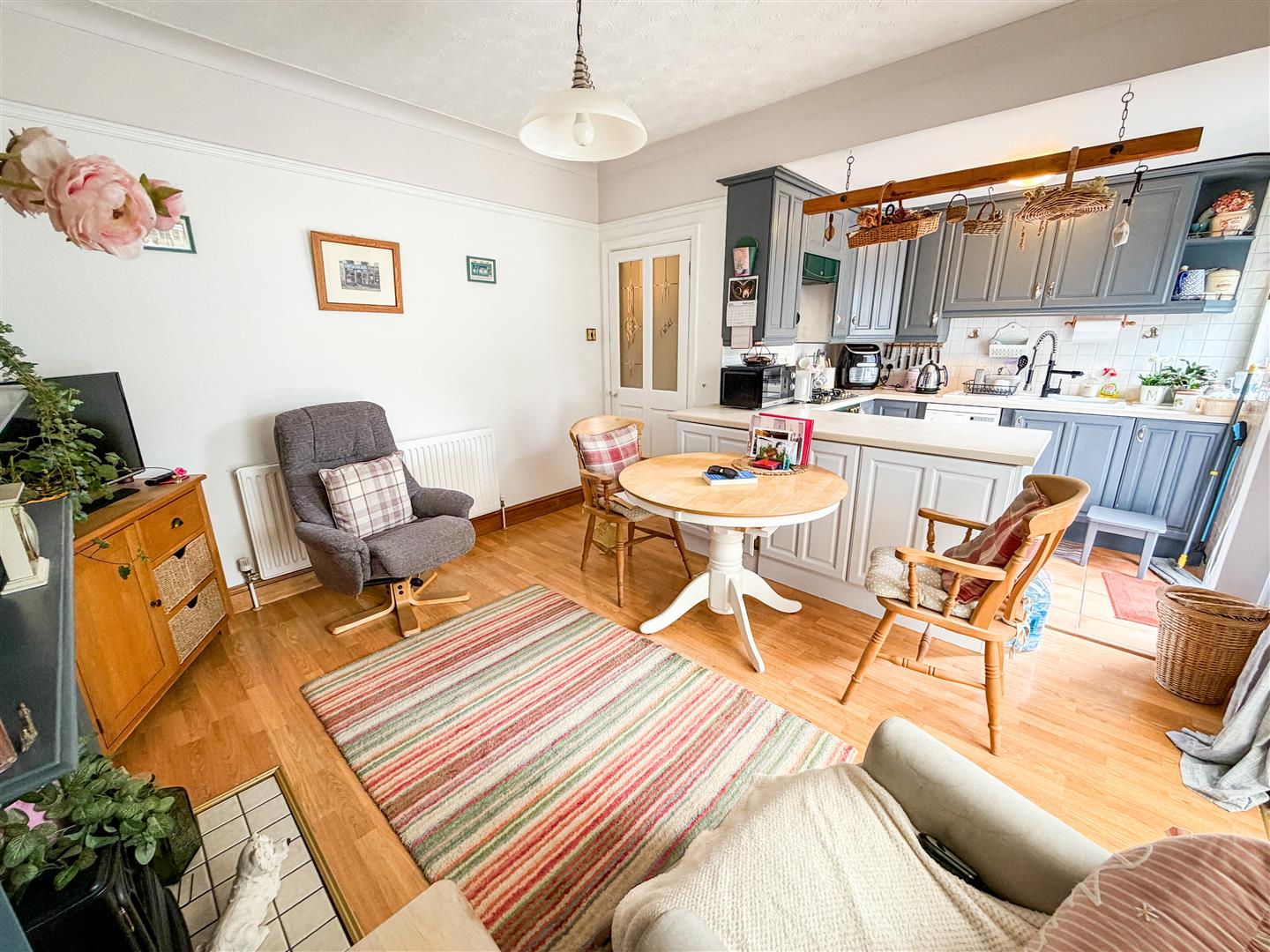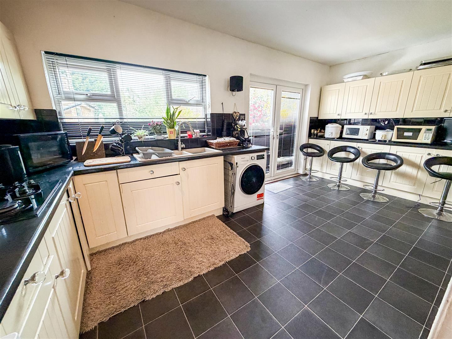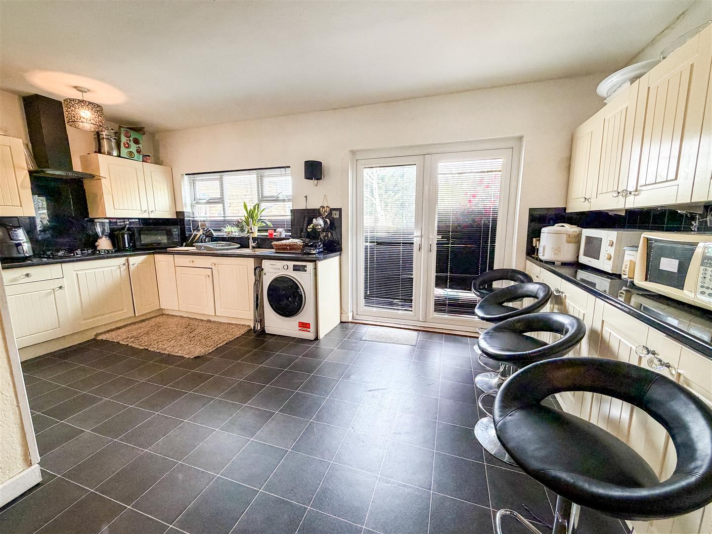 Fitted with a range of antique White grove panel laminate fronted units comprises granite effect laminated rolled edge work surfaces with cupboards and drawers below. Range of matching wall mounted units. Inset one and a half bowl single drainer sink unit with mixer tap. Inset four ring gas hob with stainless steel engraved extractor hood above (All appliances not tested). Space and plumbing for washing machine and dishwasher. Tile effect flooring. Double glazed window to rear. Double glazed double doors onto rear garden. Open access to dining room.