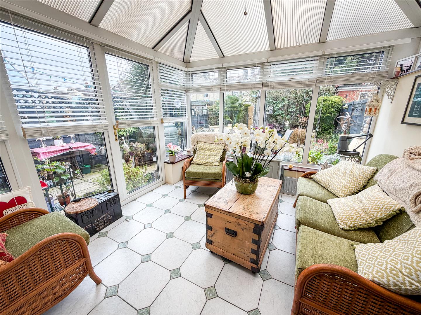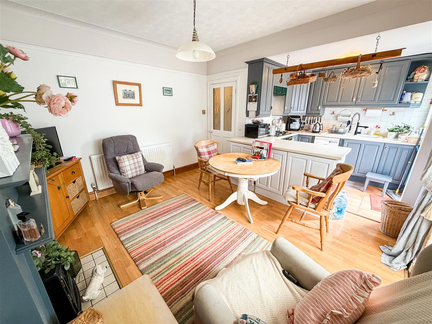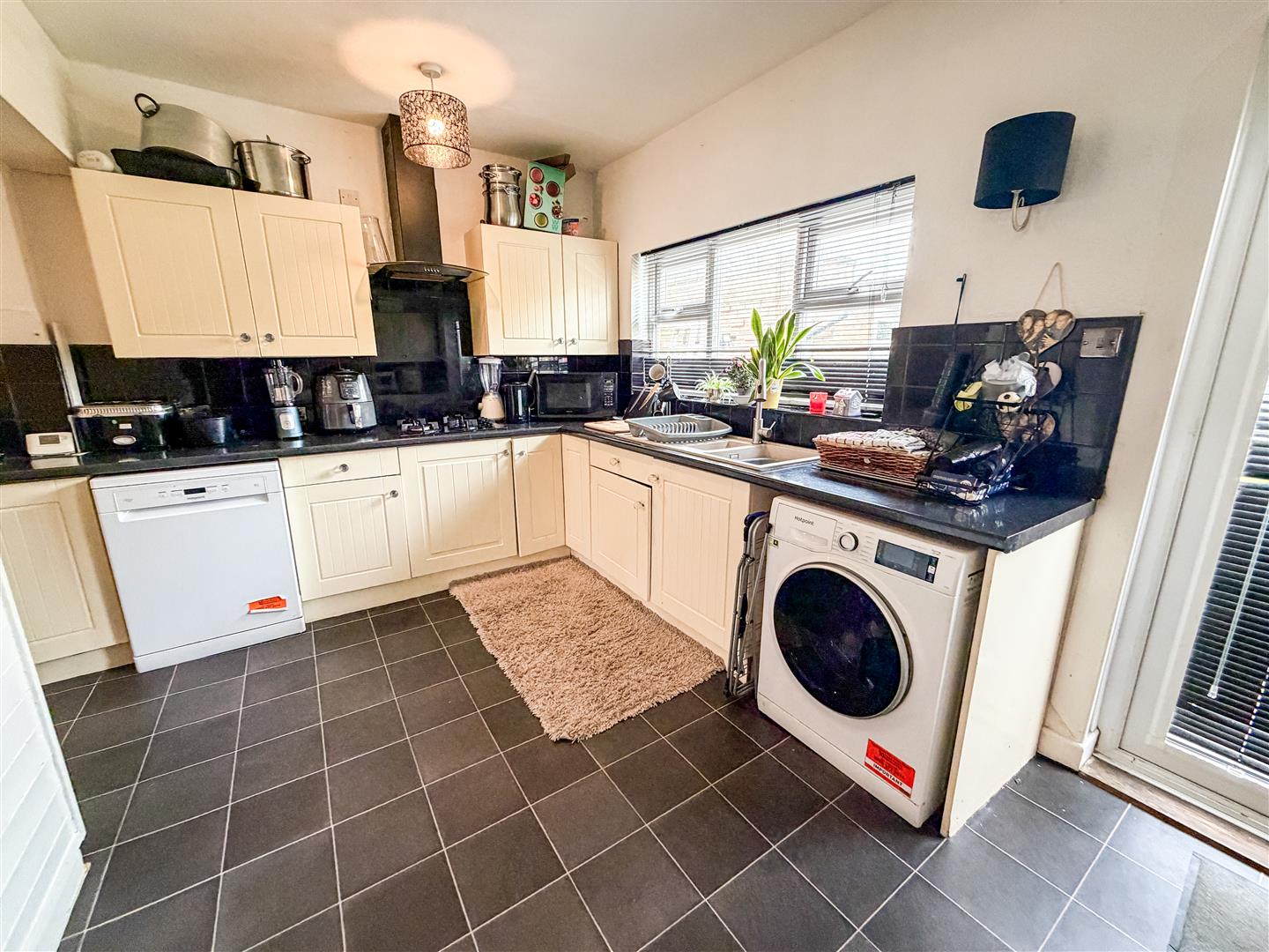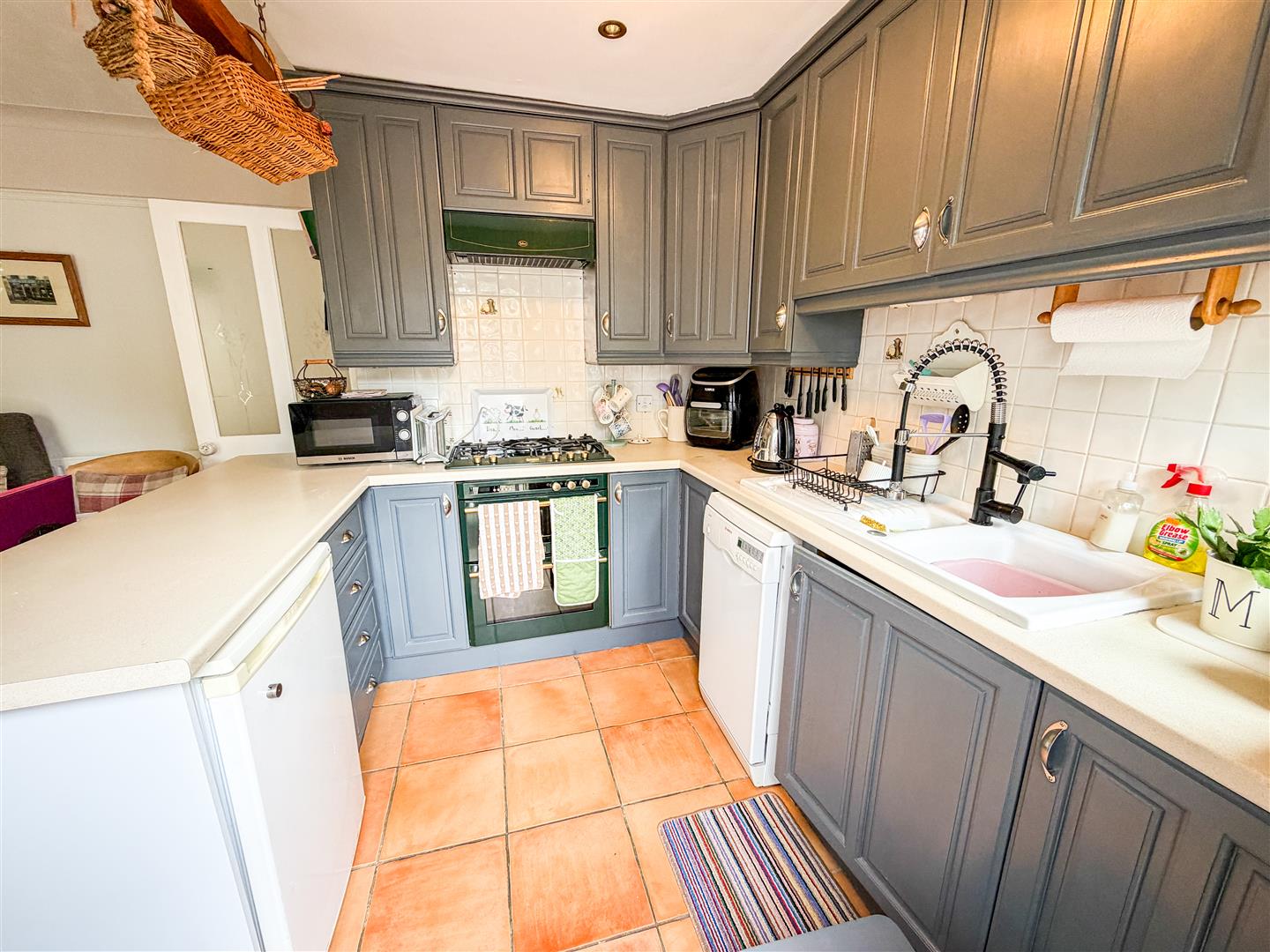 Fitted with a range of antique White grove panel laminate fronted units comprises granite effect laminated rolled edge work surfaces with cupboards and drawers below. Range of matching wall mounted units. Inset one and a half bowl single drainer sink unit with mixer tap. Inset four ring gas hob with stainless steel engraved extractor hood above (All appliances not tested). Space and plumbing for washing machine and dishwasher. Tile effect flooring. Double glazed window to rear. Double glazed double doors onto rear garden. Open access to dining room.