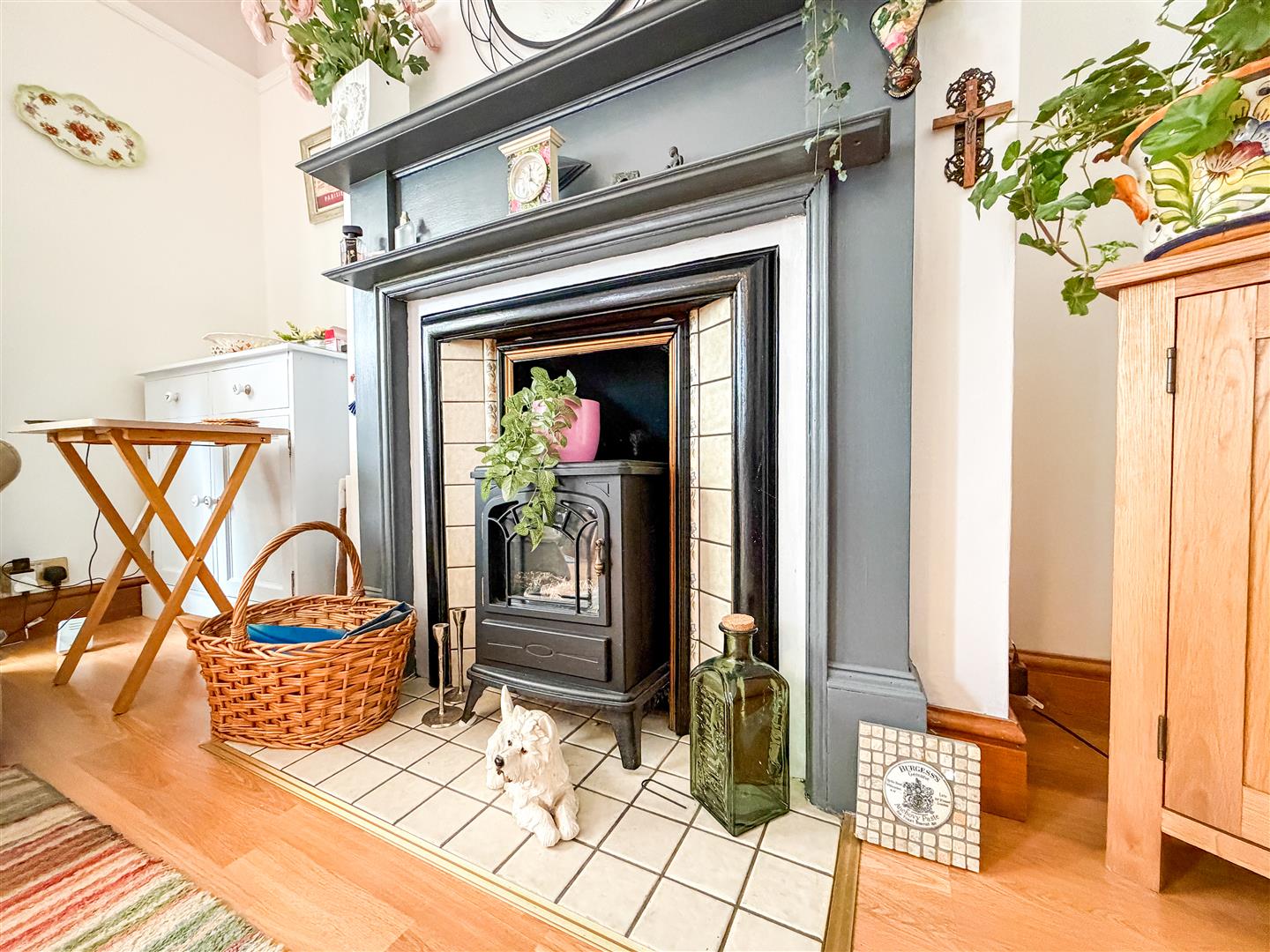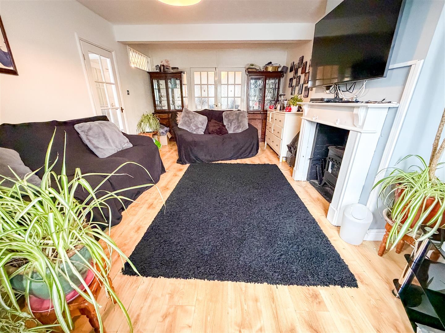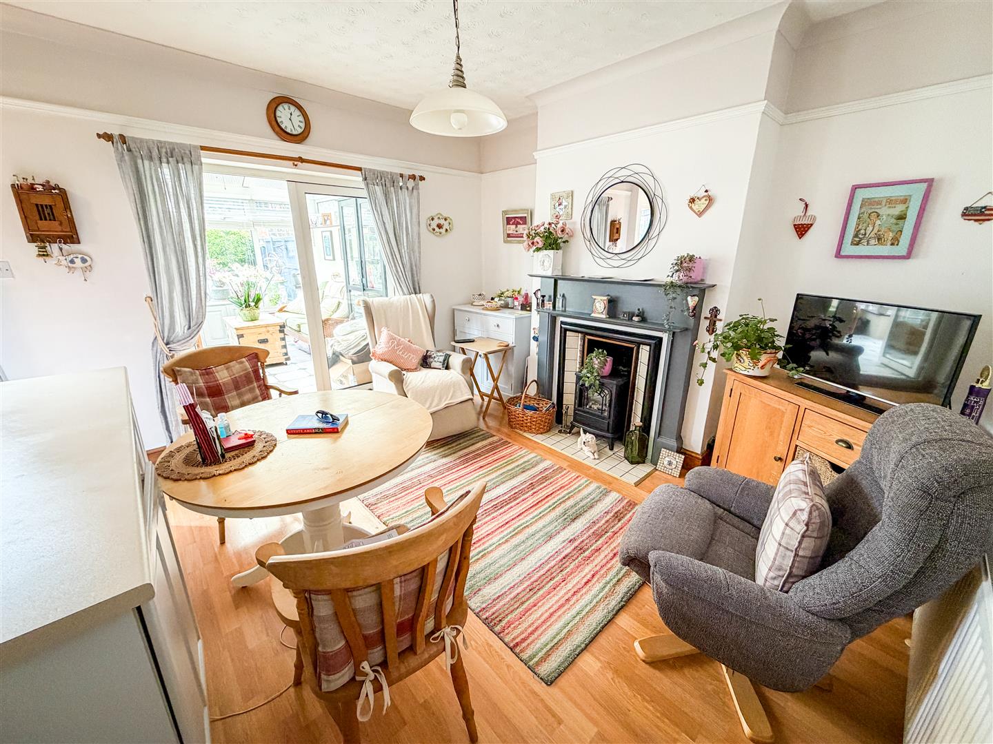Feature fireplace with inset solid fuel burner. Wood effect flooring. Radiator. Double glazed bay window to front. Multi panel glazed double doors with matching side picture windows to dining room.