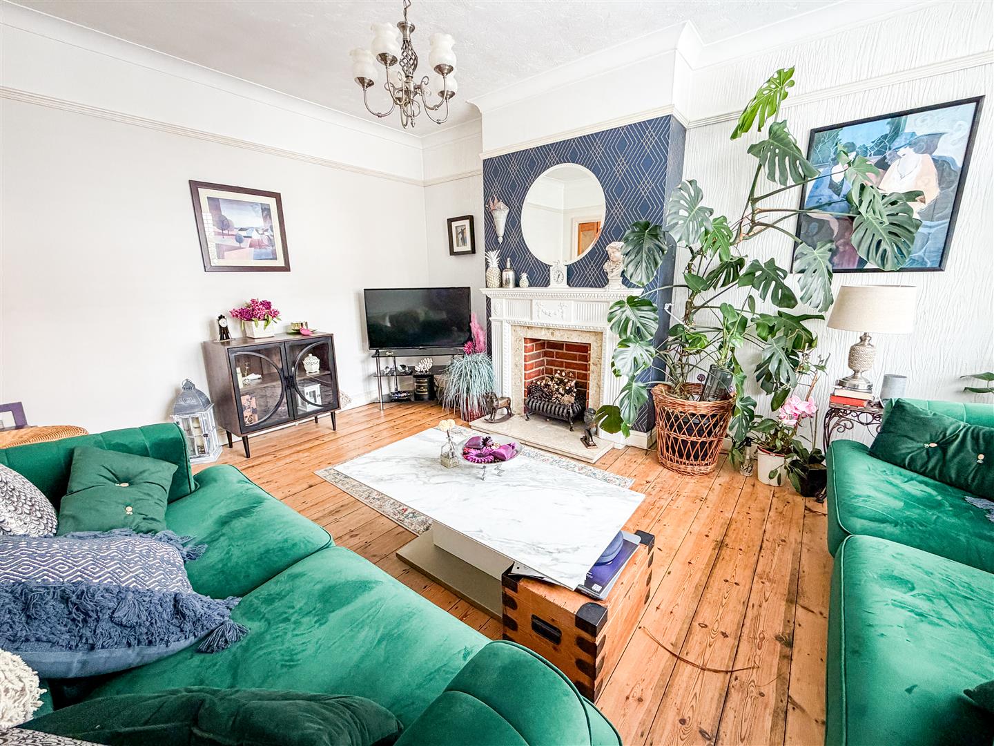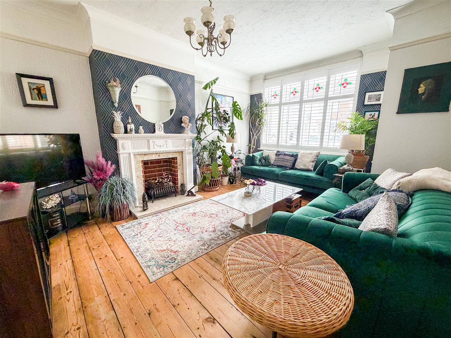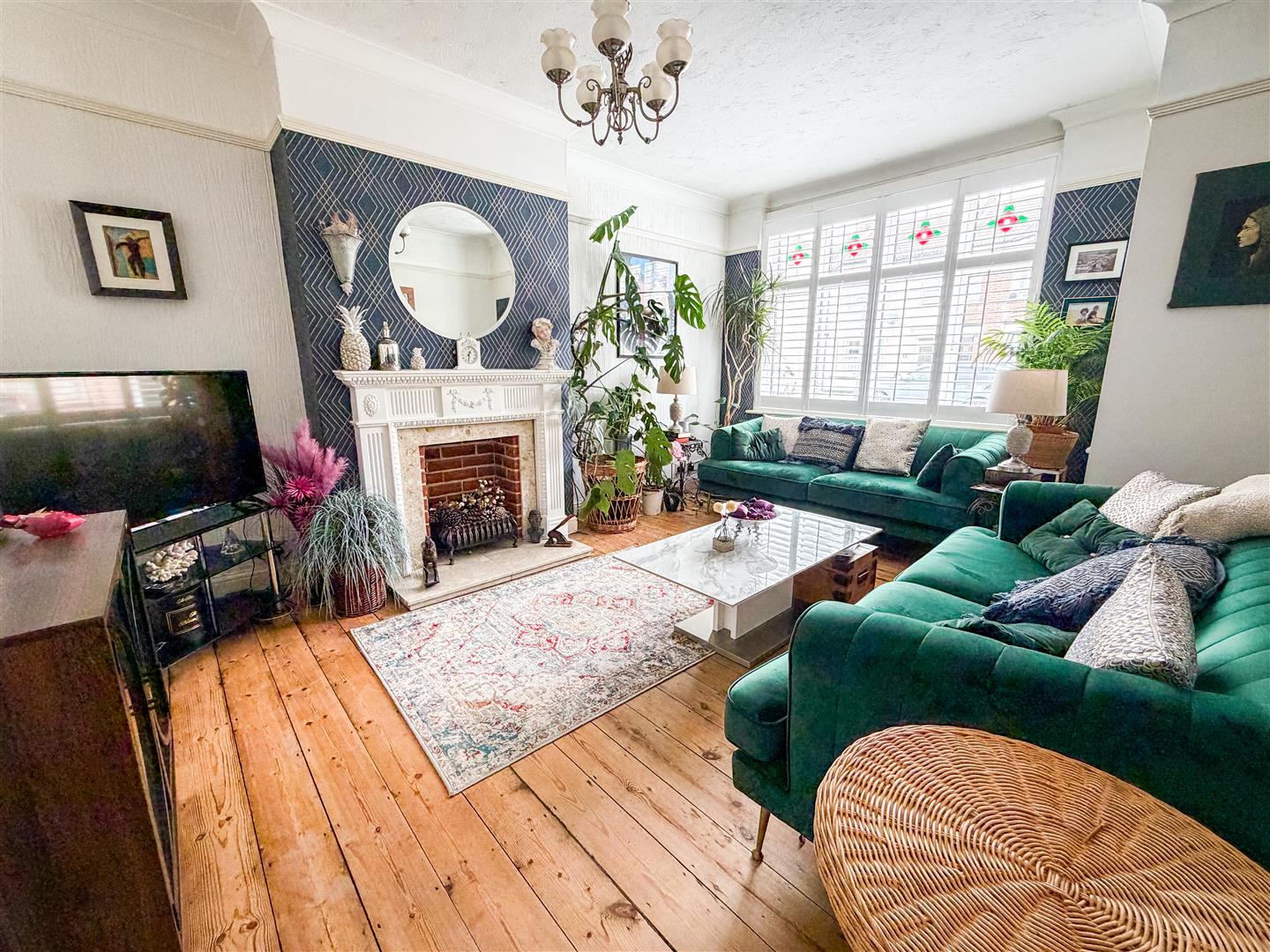 Feature fireplace with inset solid fuel burner. Wood effect flooring. Radiator. Double glazed bay window to front. Multi panel glazed double doors with matching side picture windows to dining room.