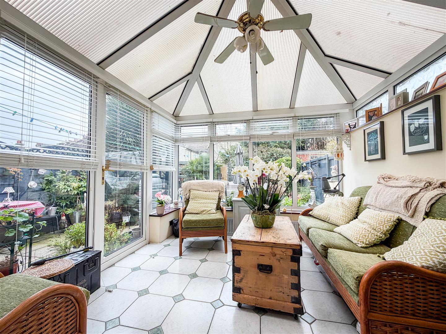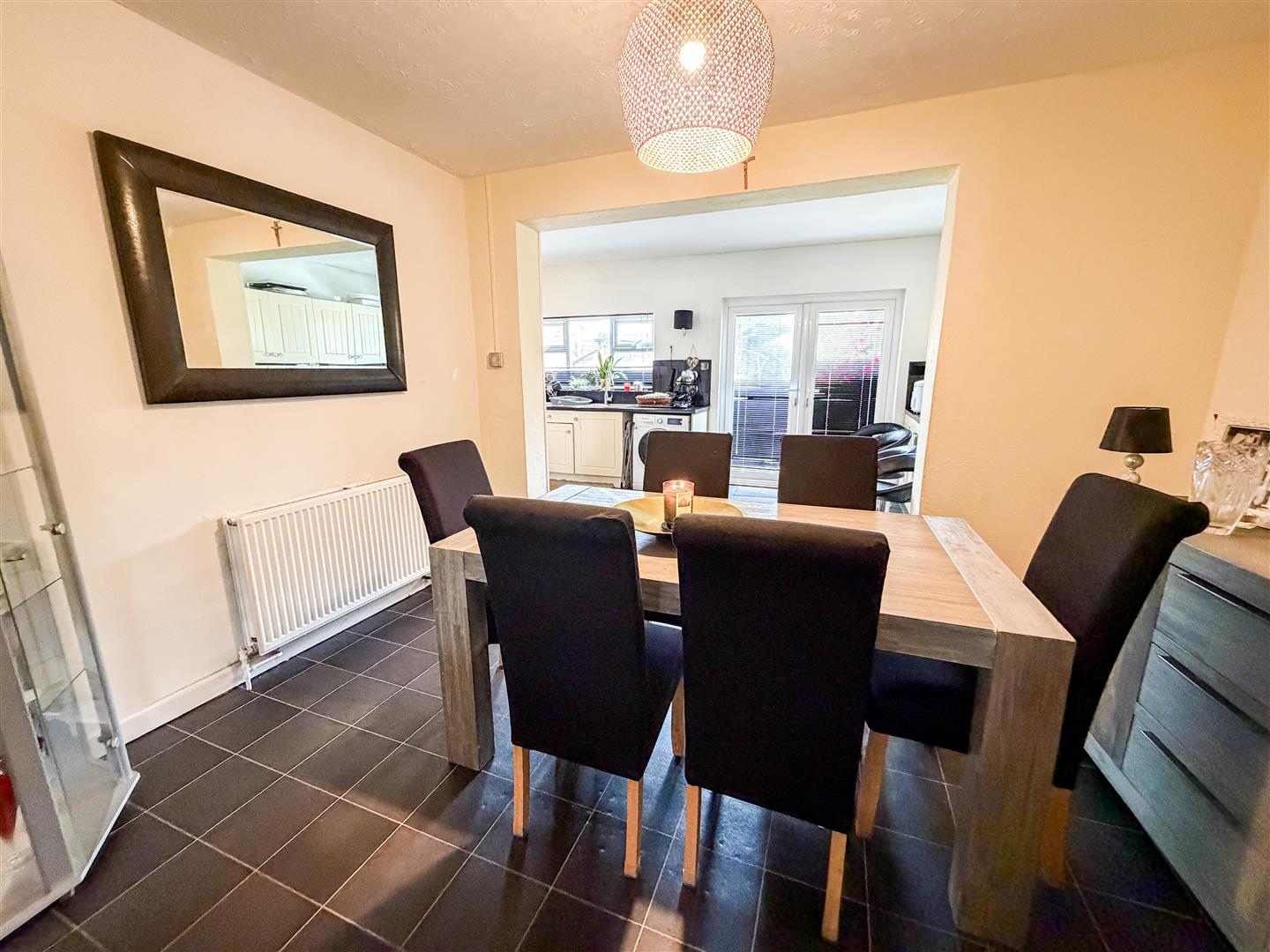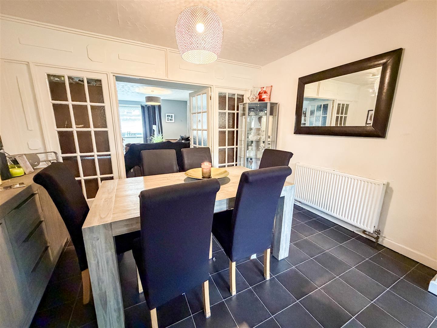 Tile effect flooring. Radiator. Multi panel glazed double doors and side picture window opening onto lounge.
