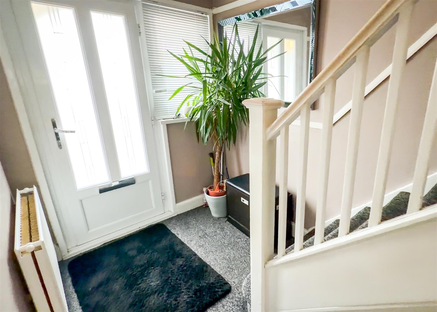 Stair flight to first floor with built in under stairs storage cupboard. Radiator. Dado rail. Picture rail. Multi panel glazed doors to lounge and kitchen.