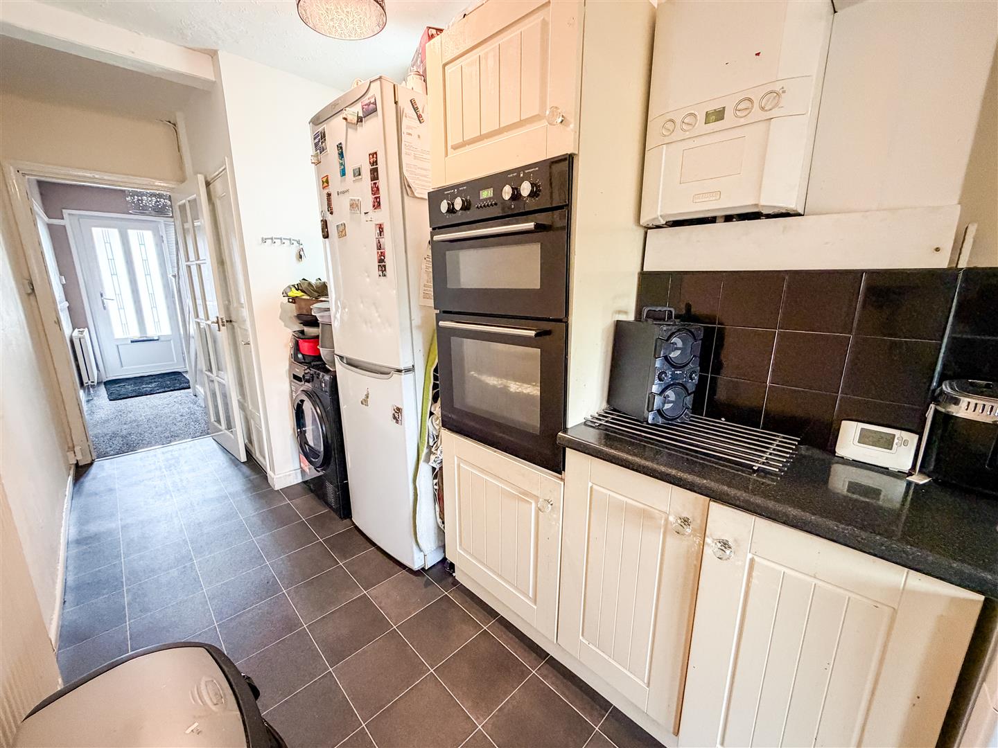 Access via the entrance hallway. Door to ground floor cloakroom. Radiator. Double glazed window to side. Tile effect flooring. Space for fridge freezer and washing machine. Inset high level double electric oven with kitchen units and worktops which opens onto the main kitchen breakfast area.