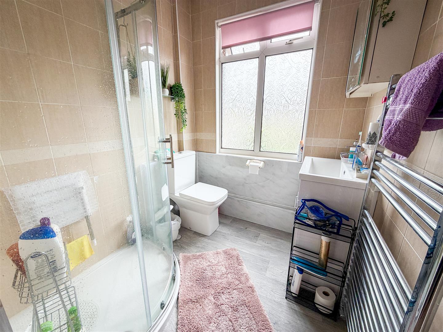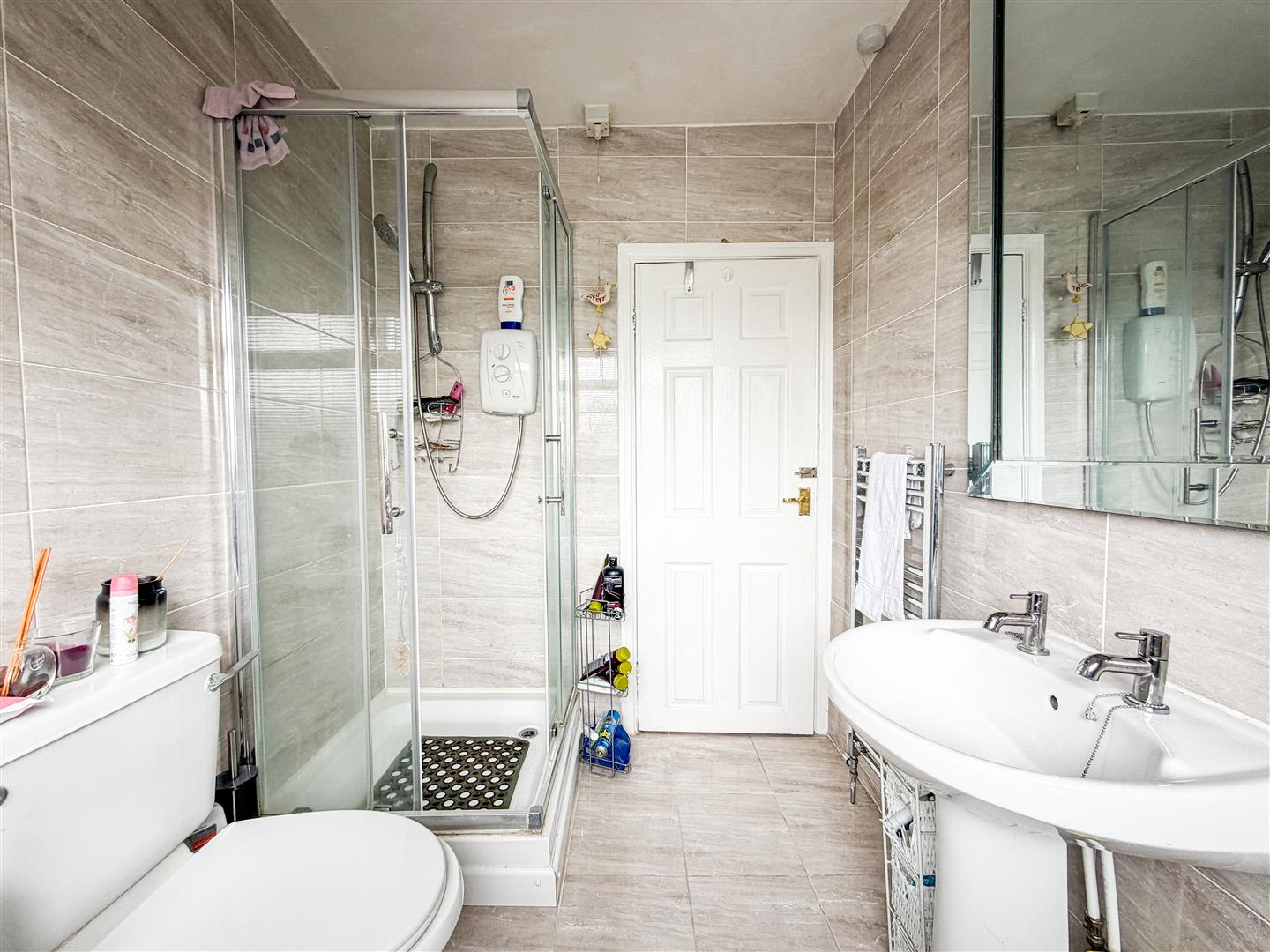 Fitted with a four piece White suite comprising panelled bath with mixer tap with shower attachment. Pedestal wash hand basin. Low level W.C. Corner shower cubicle with wall mounted electric shower (not tested). Chrome effect heated towel rail. Tiled walls. Tiled flooring. Double glazed window to front.