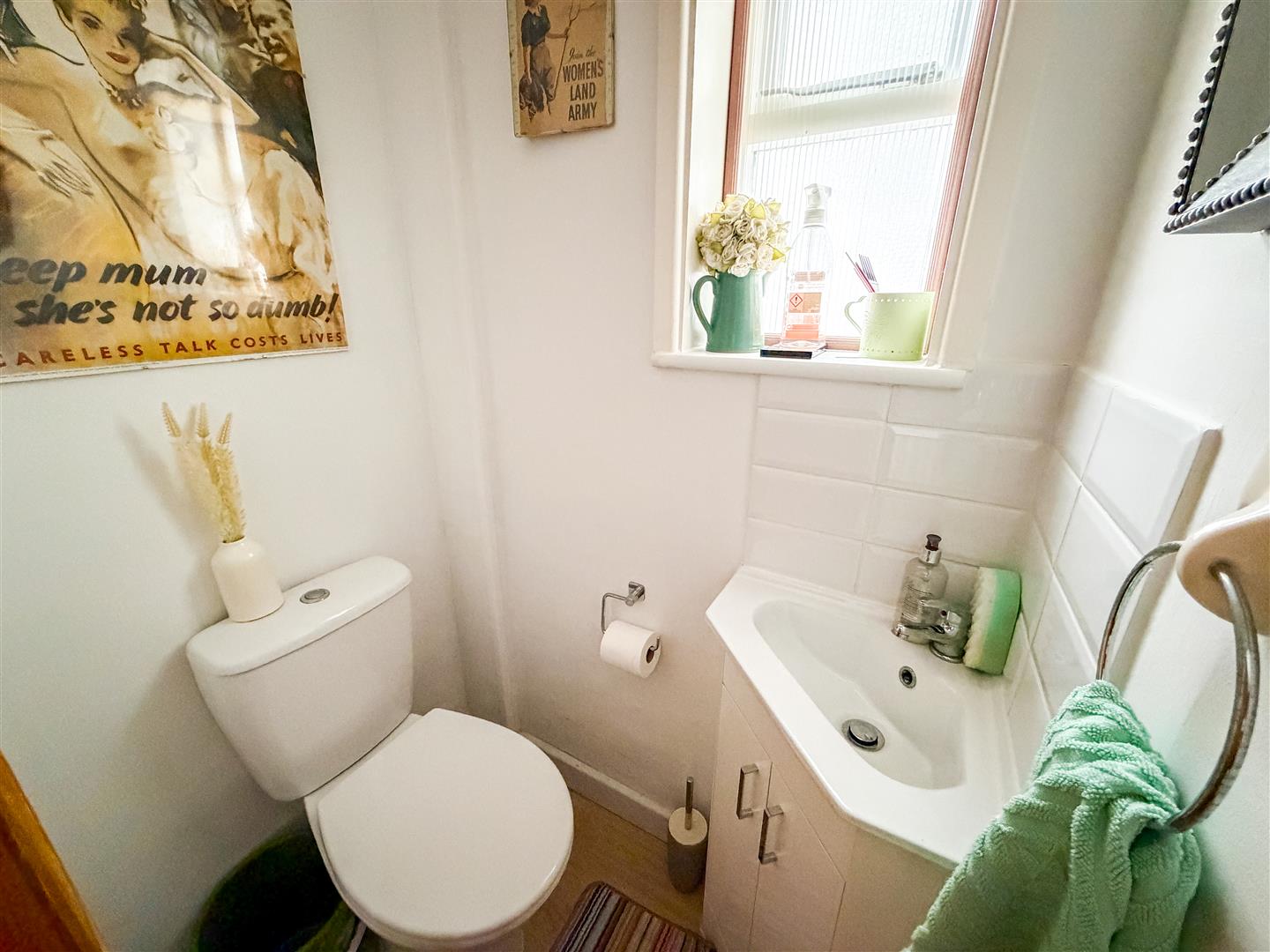Fitted white suite comprises low level W.C. Wash hand basin. Single glazed window to side. Tile effect flooring.