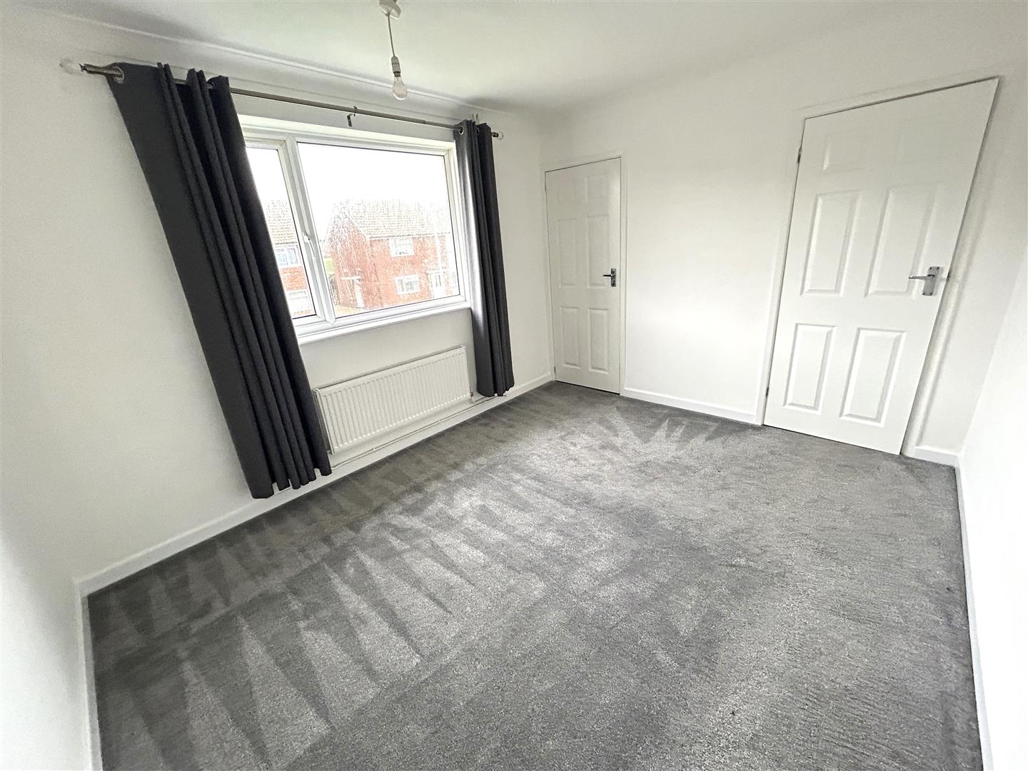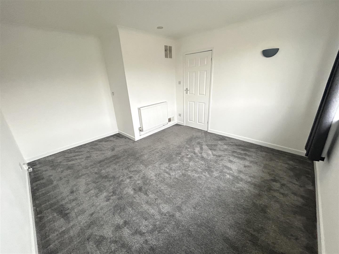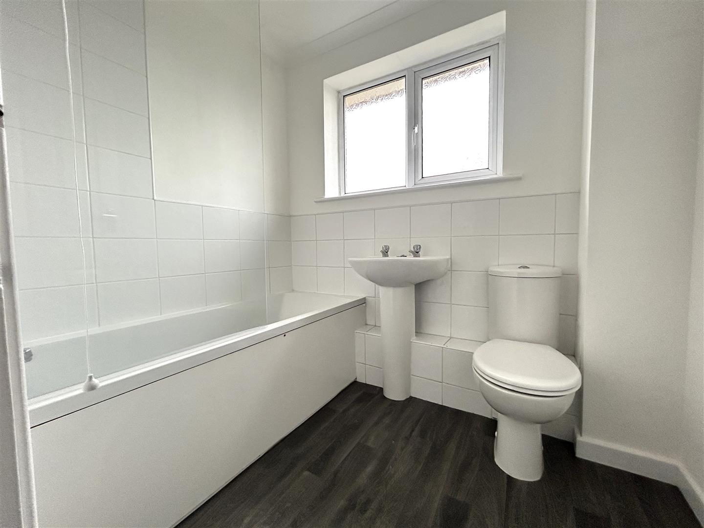 Panelled enclosed bath with showerhead attachment, hand wash basin pedestal, low level W.C. Radiator. Double glazed window to rear, part tiled walls.