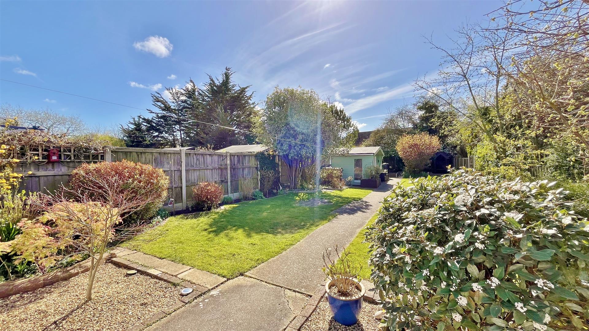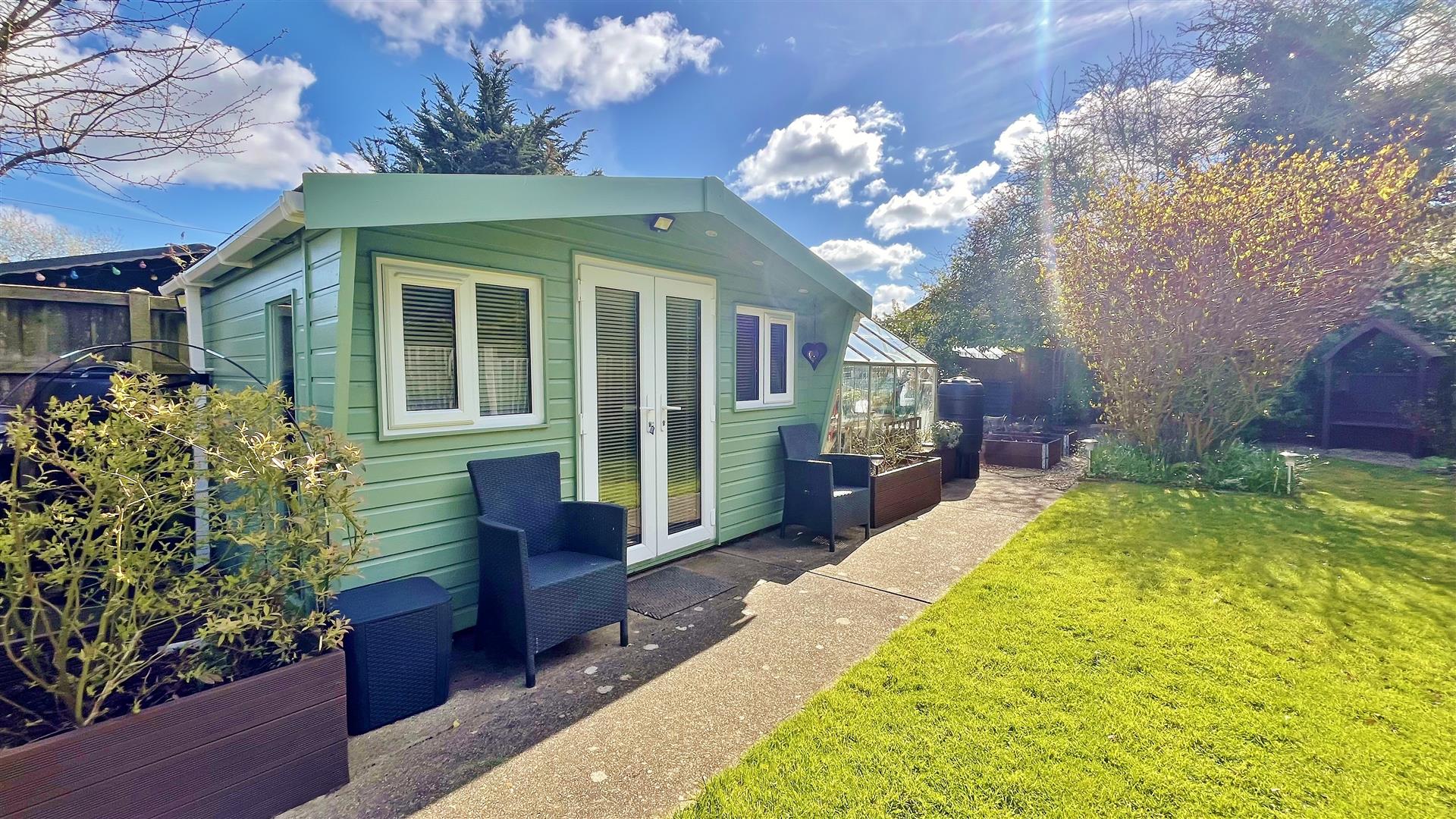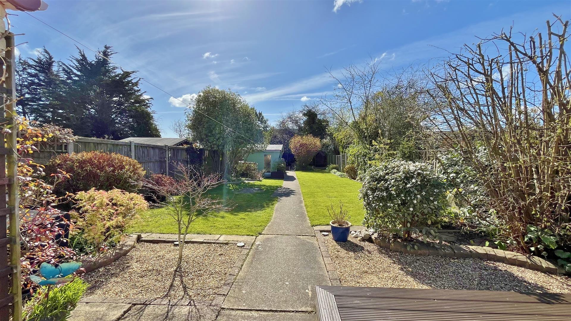 South Facing. Large rear garden comprising of an array of mature flowers, trees shrubs and bushes. Part patio area. Part artificial grass. Raised decking area. Remainder laid to lawn. Summerhouse to remain. Greenhouse to remain. Wooden gate to front. Enclosed by panelled fencing.