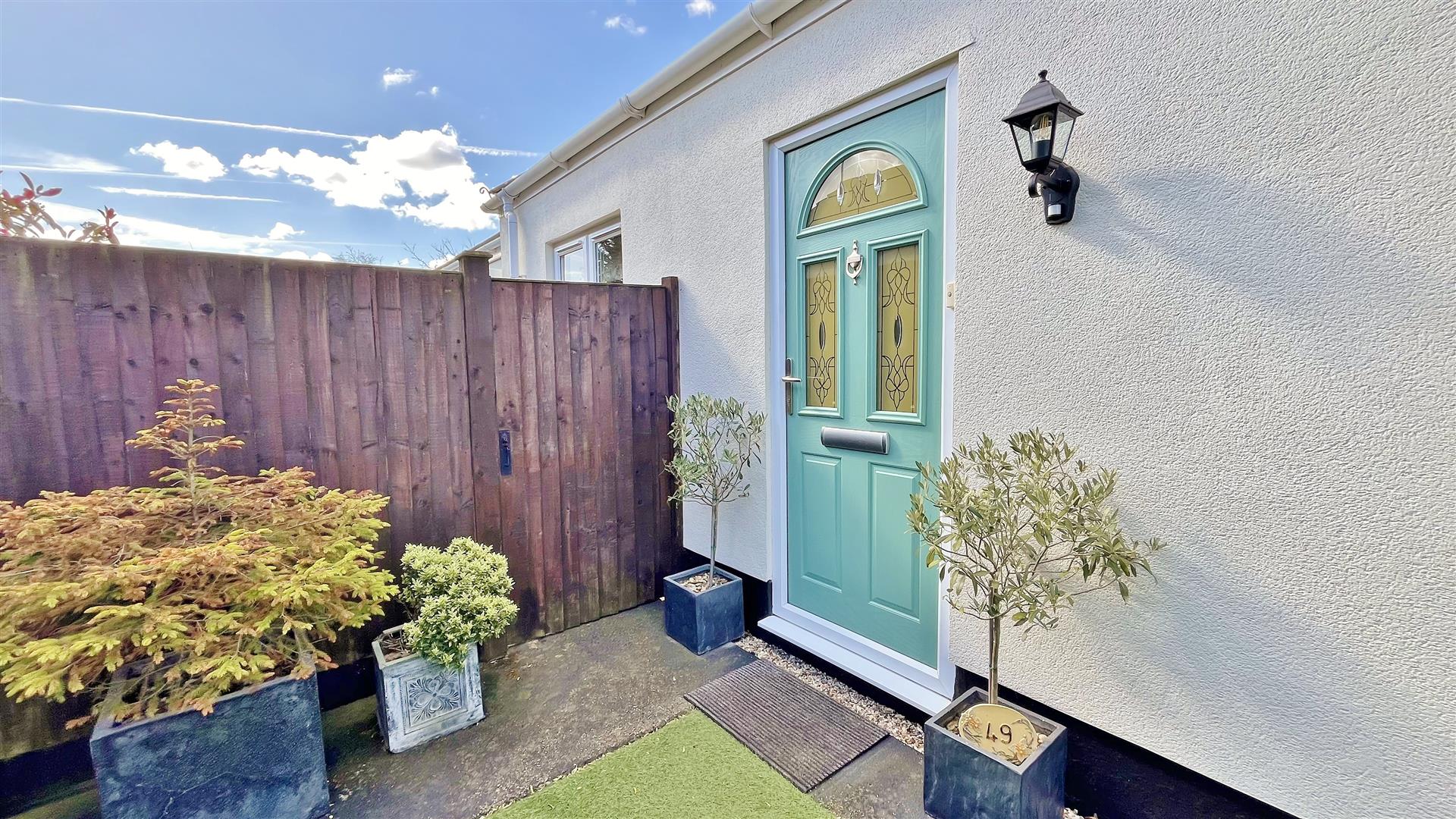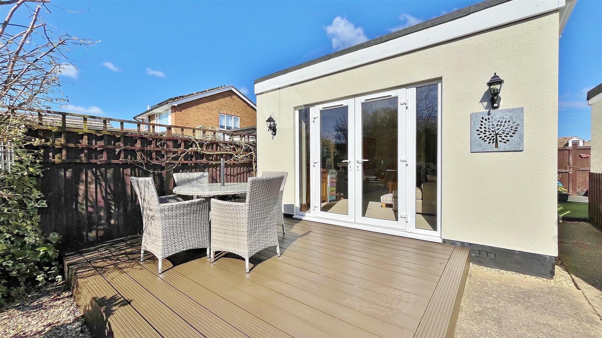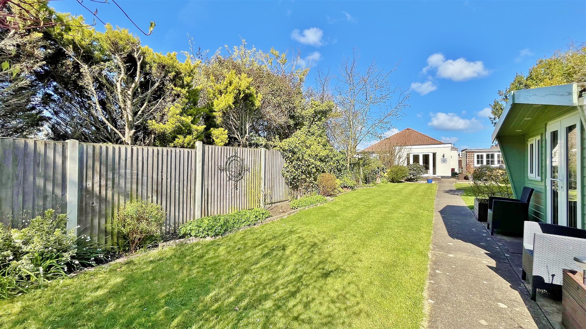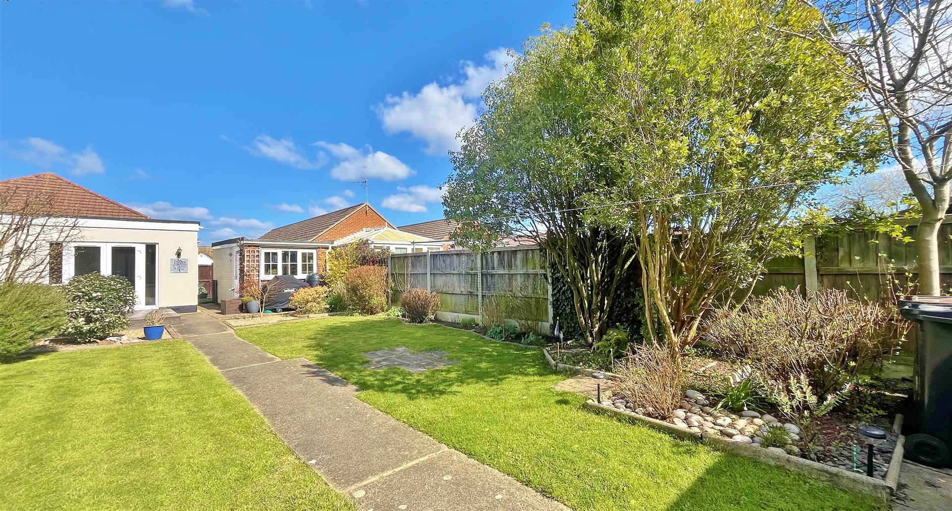 South Facing. Large rear garden comprising of an array of mature flowers, trees shrubs and bushes. Part patio area. Part artificial grass. Raised decking area. Remainder laid to lawn. Summerhouse to remain. Greenhouse to remain. Wooden gate to front. Enclosed by panelled fencing.