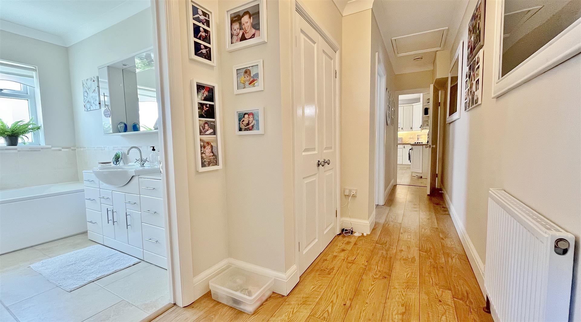 Radiator. Wood effect laminate flooring. Built in airing cupboard. Built in storage cupboard housing combination boiler providing hot water and heating throughout. Loft access via loft hatch with pull down ladder (fully boarded with potential for loft conversion S.T.P.P). Doors to:-