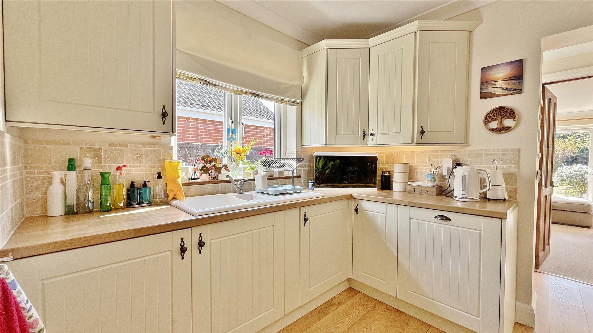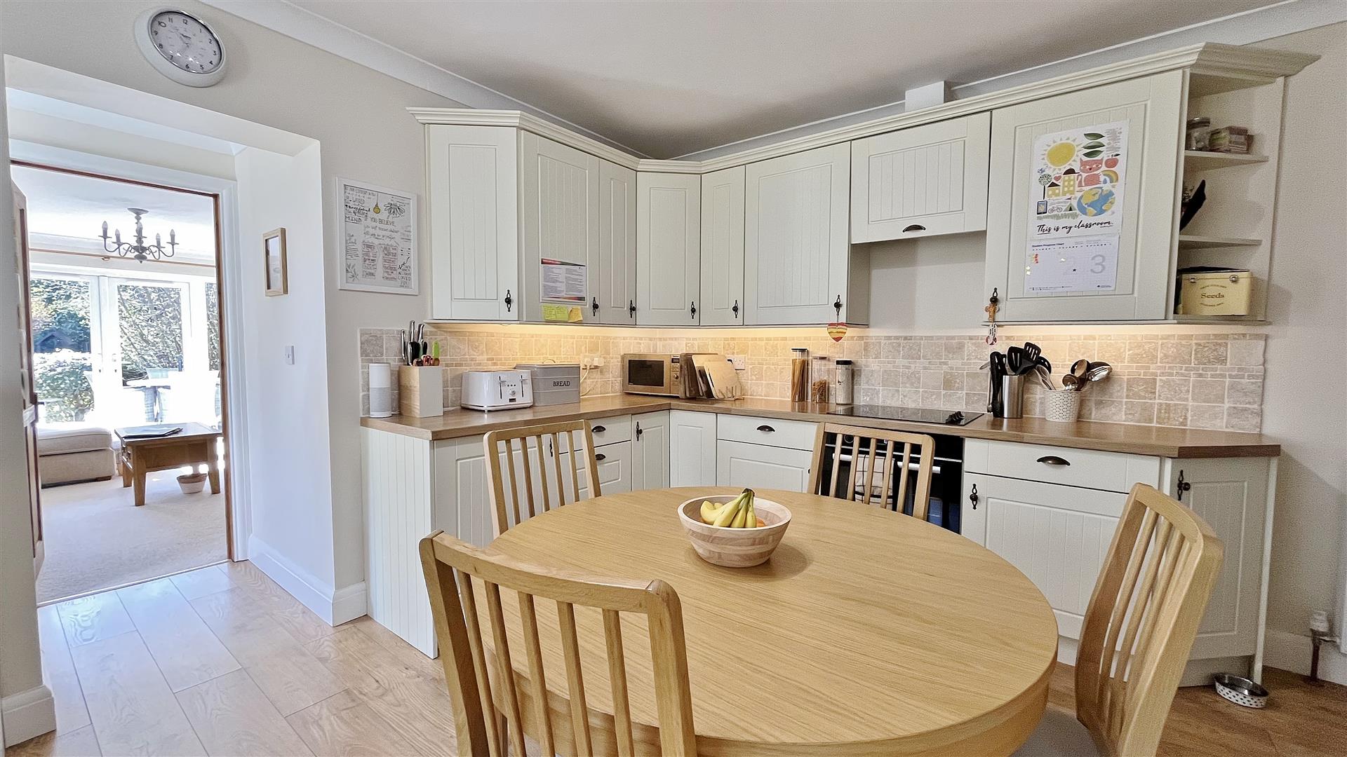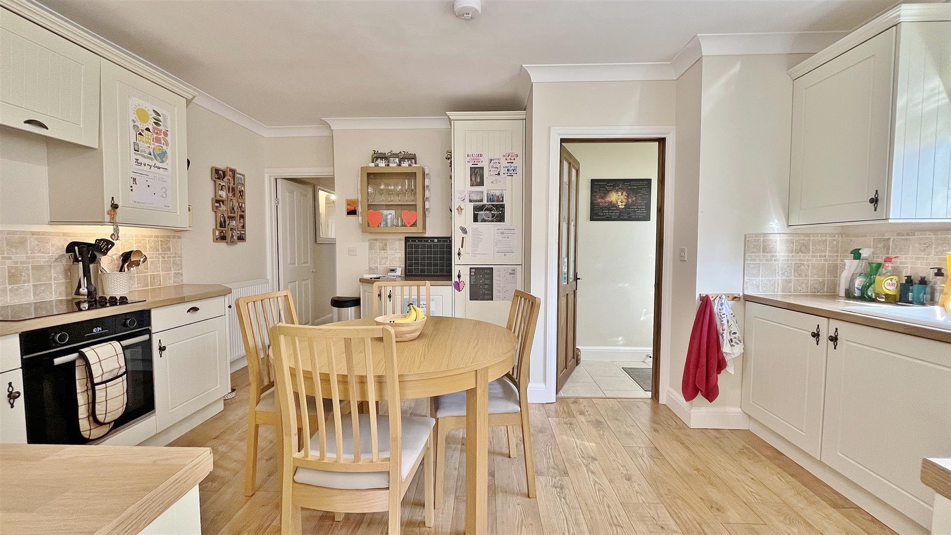 Fitted in a range of matching fronted units. Wood effect square edge work surfaces. Inset ceramic one and a half sink bowl and drainer unit. Inset four ring electric hob with extractor hood above and electric oven under. Further range of matching units both eye and floor level. Integrated washing machine, dishwasher and fridge/freezer. Tiled splash back. Wood effect laminate flooring. Radiator. Sealed unit double glazed window to side. Opening to:-
