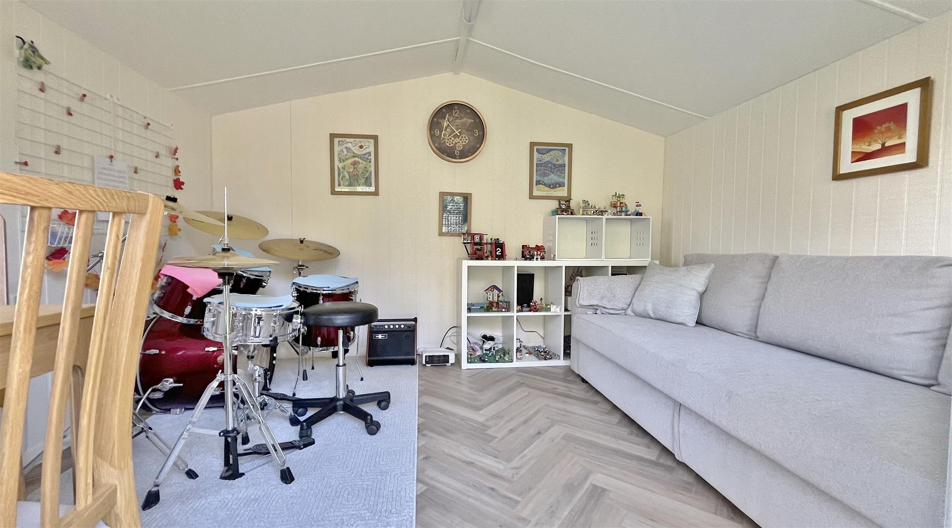 Wood effect laminate flooring. Sealed unit double glazed door to garden. Door to:-