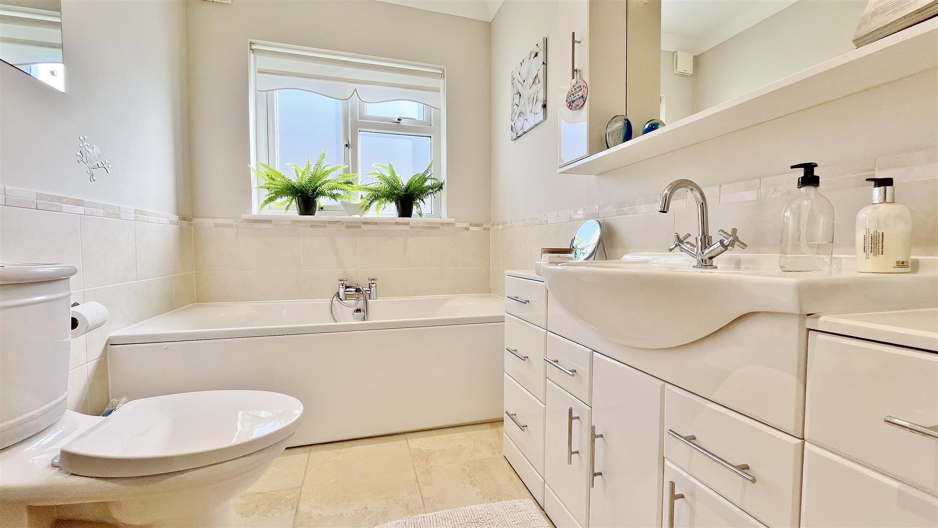 White suite comprises of low level w/c. Vanity hand wash basin with storage cupboards and drawers under. Fitted panelled bath. Heated towel rail. Spotlights. Extractor fan. Fully tiled walls and flooring. Obscured sealed unit double glazed window to side.
