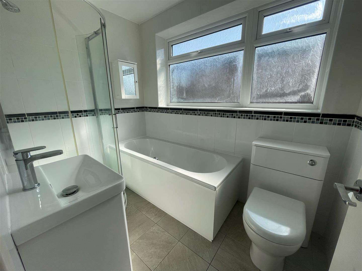 Four piece suite. Low level WC. Vanity hand wash basin with mixer tap and storage space under. Enclosed panelled bath. Fitted corner shower cubicle with wall mounted shower attachment. Fully tiled walls. Tiled flooring. Wall mounted heated towel rail. Obscured sealed unit double glazed window to side.