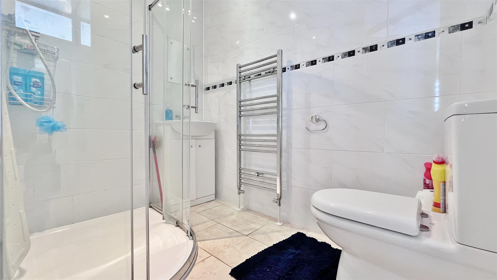 White suite comprises low level w/c. Vanity wash hand basin with mixer tap and storage space under. Fitted shower cubicle with wall mounted shower attachment. Fully tiled walls. Tiled flooring. Extractor fan. Spotlights. Wall mounted heated towel rail.