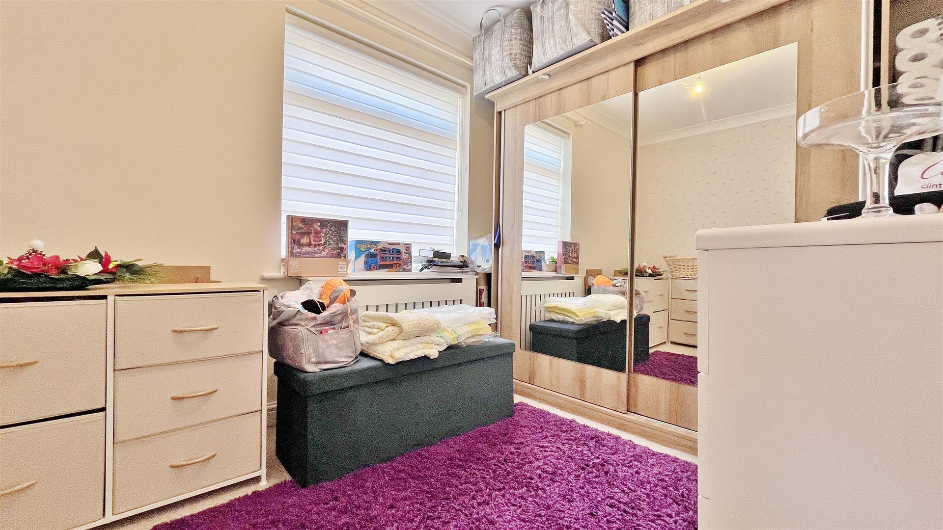 White suite comprises low level w/c. Vanity wash hand basin with mixer tap and storage space under. Enclosed panelled bath with wall mounted shower attachment. Fully tiled walls. Tiled flooring. Spotlights. Wall mounted heated towel rail. Obscured sealed unit double glazed window to side.