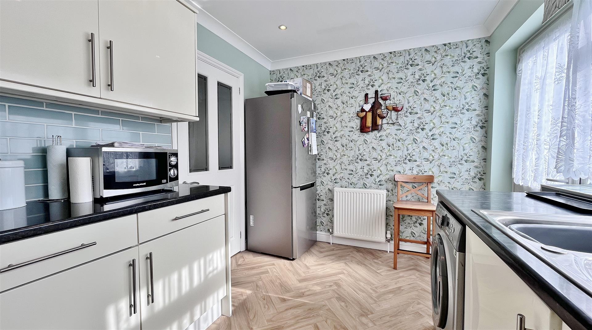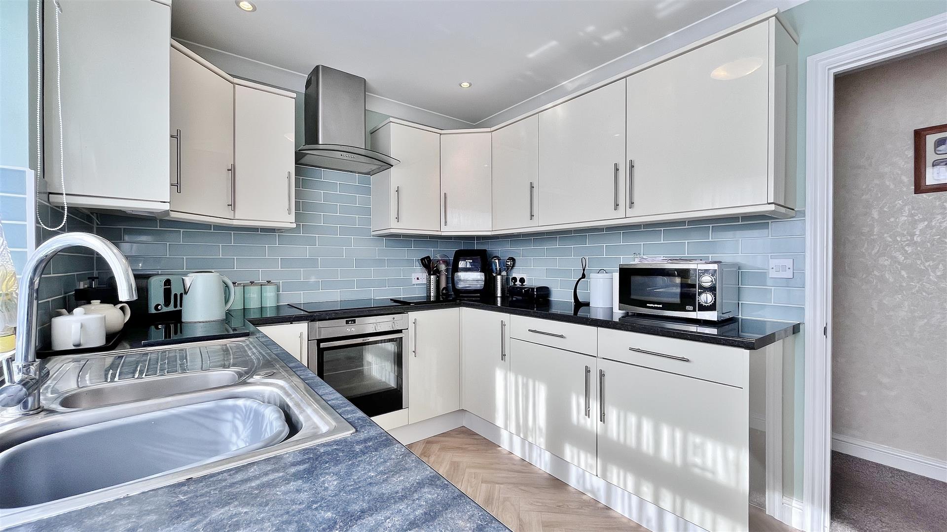 Fitted with a range of matching high gloss fronted units. Marble effect rolled edge worksurfaces. Inset stainless steel one and a half bowl sink drainer unit. Inset four ring electric hob with electric oven under and fitted extractor fan above. Further selection of matching units at both eye and floor level. Part tiled walls. Vinyl flooring. Integrated dishwasher. Plumbing for washing machine. Space for fridge/freezer. Spotlights. Radiator. Sealed unit double glazed window to side. Obscured sealed unit double glazed door to side.
