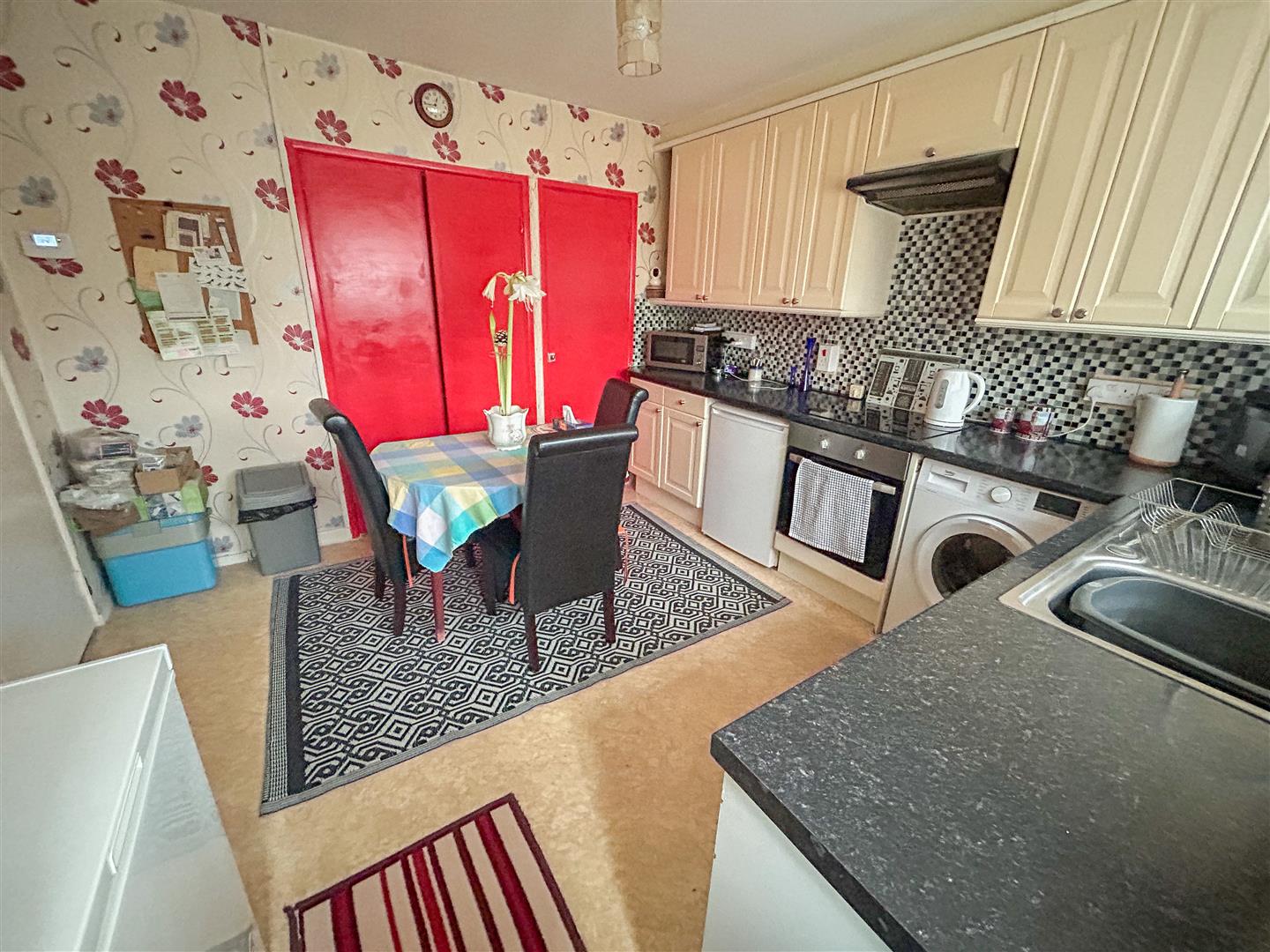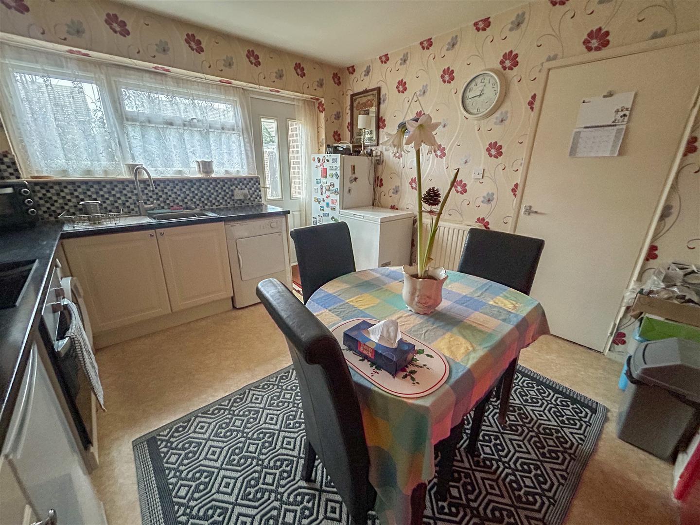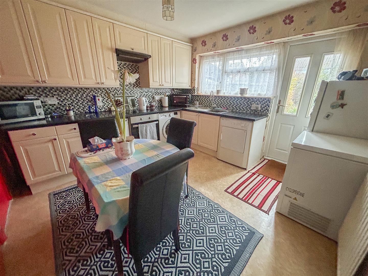 Fitted with a range of panel fronted units. Comprises laminated rolled edge work surfaces with cupboards and drawers below. Range of matching wall mounted units. Inset single drainer stainless steel sink unit with mixer tap. Space and plumbing for washing machine and tumble dryer. Plumbing and space for dishwasher (currently used as undercounter fridge space). Additional tall fridge and single chest freezer space. Tiled splash backs. Inset four ring ceramic electric hob with fitted under counter electric oven and extractor hood above (all appliances not tested). Wall mounted cupboard housing gas boiler providing hot water and central heating system (not tested. Boiler installed February 2023). Radiator. Built in double storage cupboard. Additional built in storage cupboard. Double glazed window overlooking rear garden. Double glazed door to rear garden.