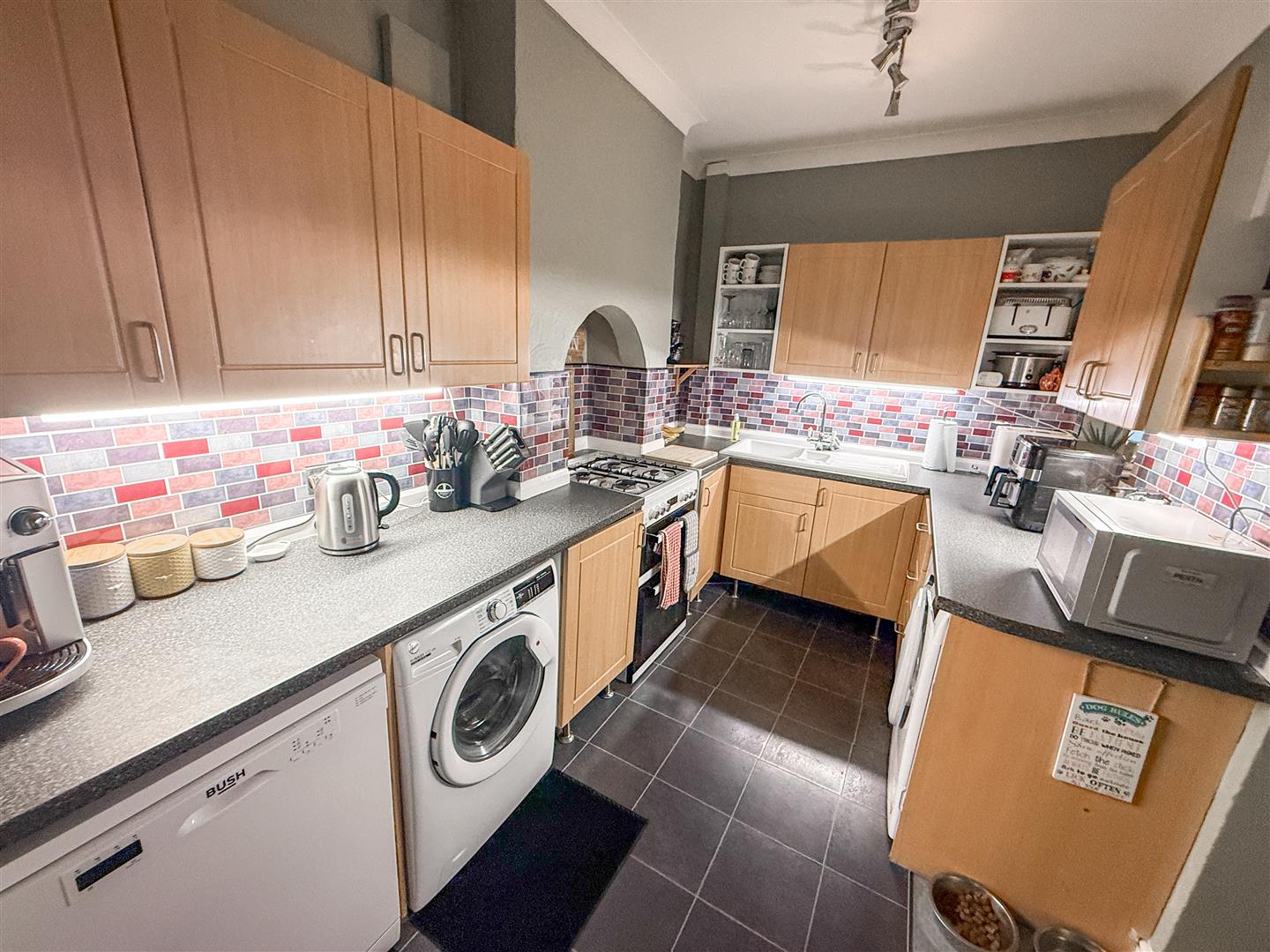 Fitted with a range of Beech effect laminated panelled fronted units. Laminated rolled edge work services with cupboards, drawers & storage space under. Range of matching wall mounted cabinets. Inset one and half bowl ceramic sink unit with mixer taps. Cooker space. Space & plumbing for washing machine, dishwasher and tumble dryer. Tiled splashbacks. Tile effect flooring. Archway and open access to Dining Room.