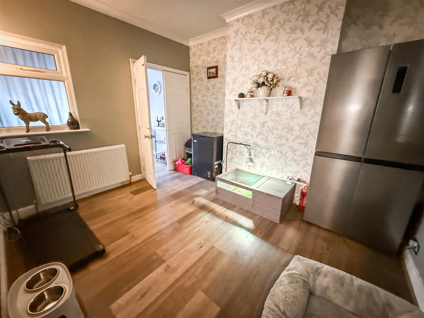 Radiator. Wood effect flooring. Tall American style fridge/freezer space. Wood effect flooring. Radiator. Internal window to sitting room. Double doors to Sitting Room.
