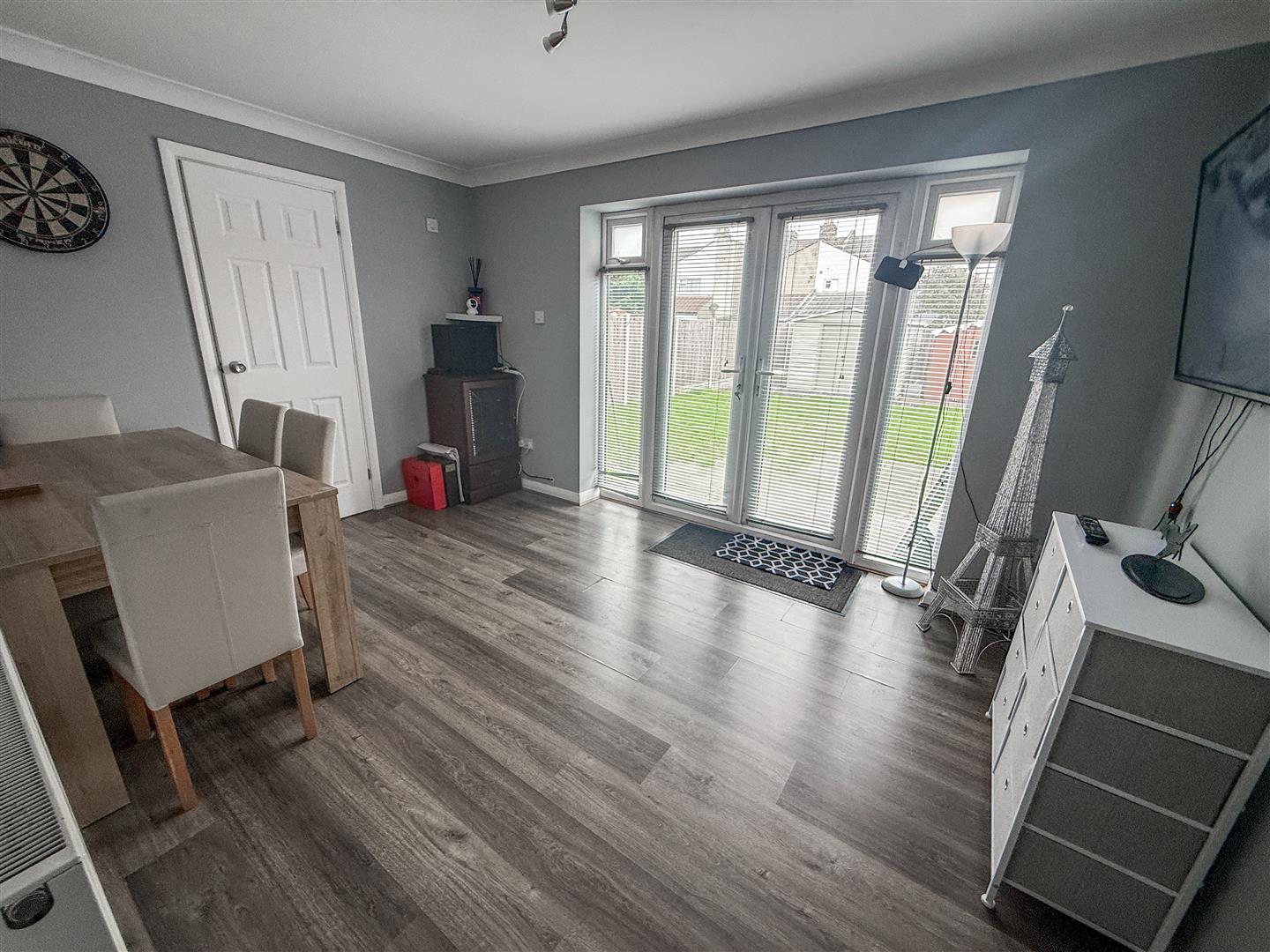Wood effect flooring. Radiator. Double glazed double doors with matching side double glazed picture windows to rear garden. Door to Ground Floor Shower Room.