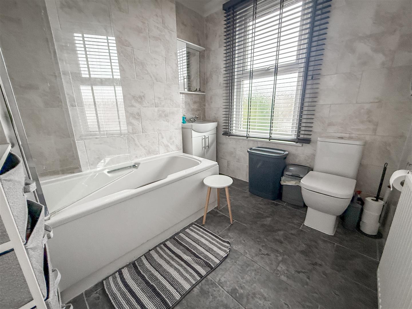 Fitted with a modern three piece white suite. Comprises panelled bath with shower unit over and with glazed shower screen. Vanity wash hand basin with cupboards below. Low level WC. Fully tiled walls. Tiled flooring. Radiator. Double glazed window to rear.