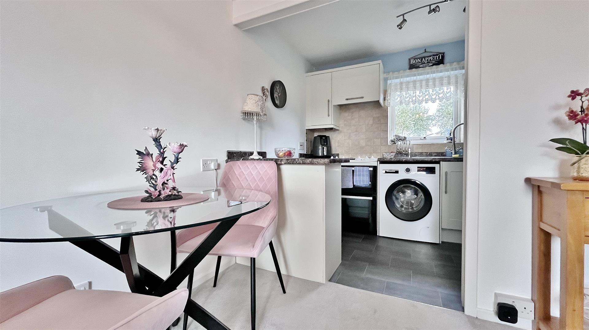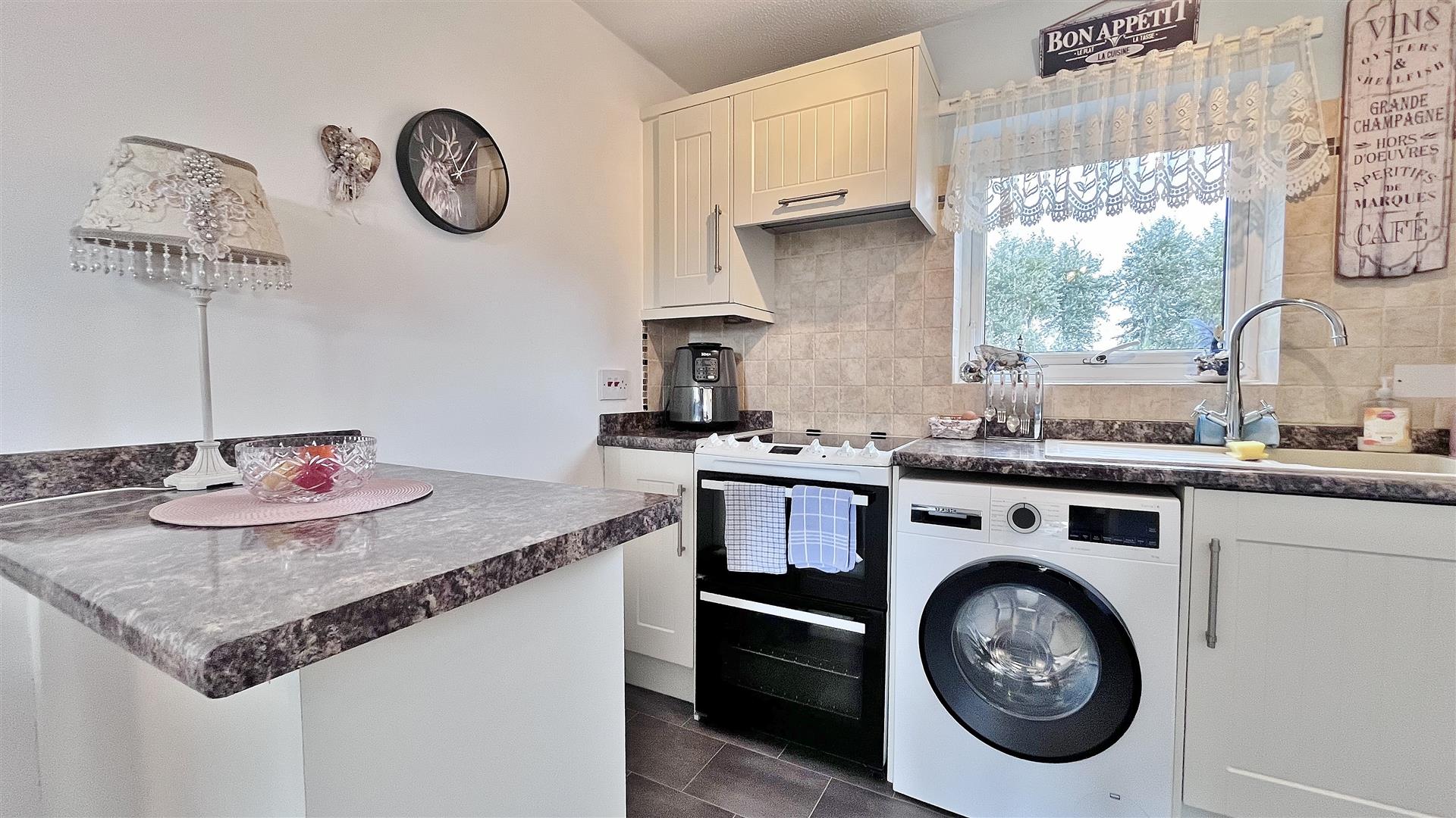 Fitted in a range of matching fronted units. Fitted rolled edge work surfaces. Inset ceramic sink bowl and drainer unit. Space for cooker with electric extractor hood above. Future range of matching fronted units both eye and floor level. Plumbing for washing machine. Space for fridge/freezer. Tiled splash back. Vinyl flooring. Sealed unit double glazed window to rear.
