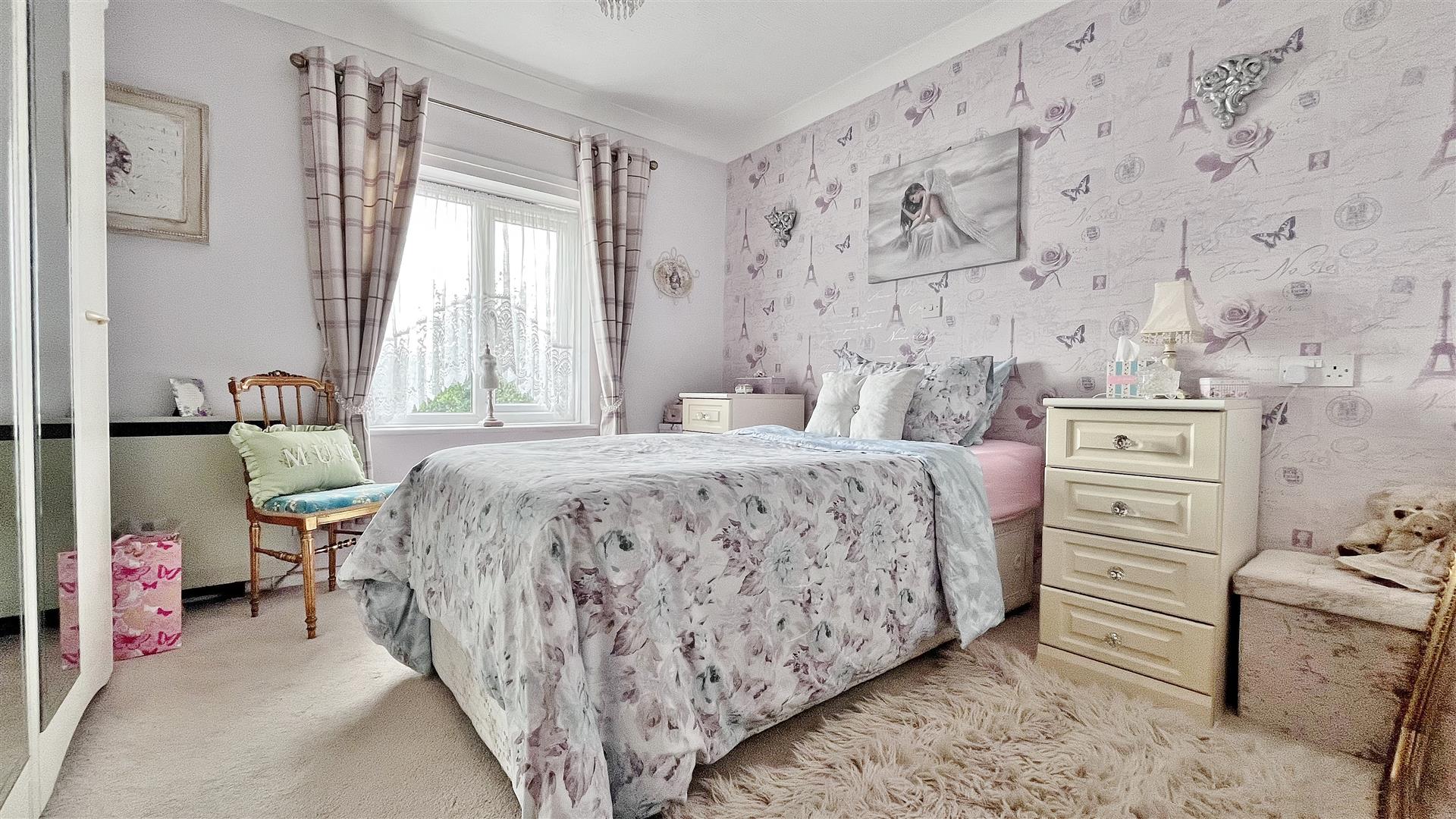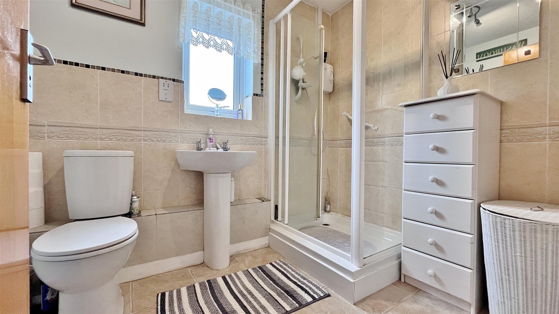 Suite comprises of low level w/c. Pedestal hand wash basin. Fitted shower cubical with wall mounted shower attachment. Part tiled walls. Tiled flooring. Heated towel rail. Obscured sealed unit double glazed window to rear.