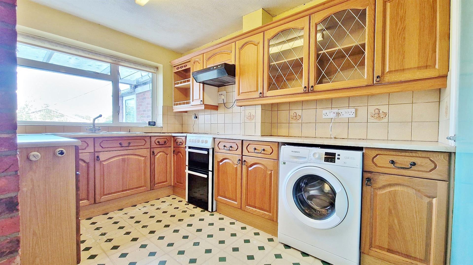 Fitted in a range of matching fronted units. Marble effect rolled edge work surfaces. Inset stainless steel one and a half sink bowl and drainer unit. Further range of matching fronted units both eye and floor level. Space for electric oven with extractor hood above. Plumbing for washing machine. Two built in storage cupboards. Part tiled walls. Vinyl flooring. Sealed unit double glazed window to rear. Opening to:-