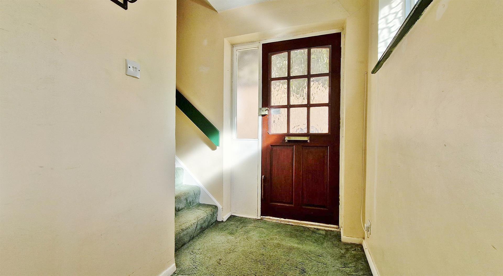 Stair-flight to first floor. Obscured sealed unit double glazed window to side. Obscured sealed unit single glazed door to:-