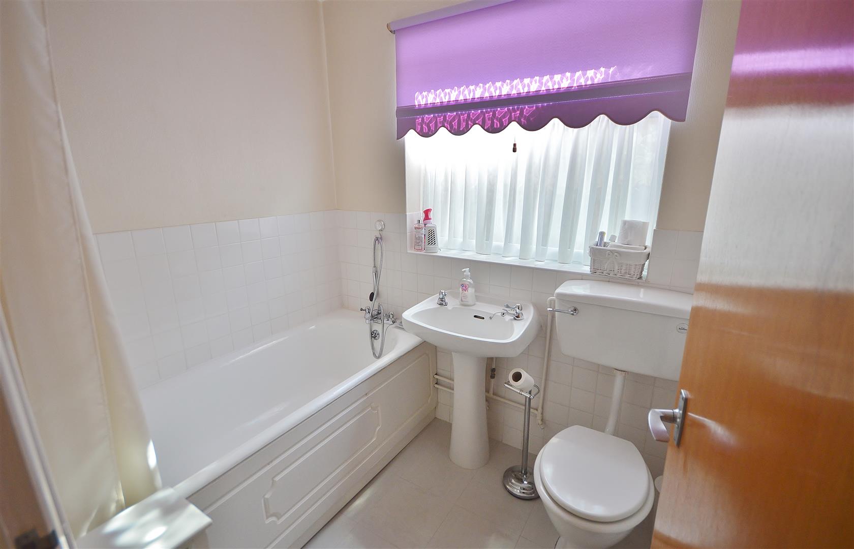 Suite comprising of low level W.C. Pedestal hand wash basin. Panelled bath with shower attachment. Radiator. Double glazed window to side.