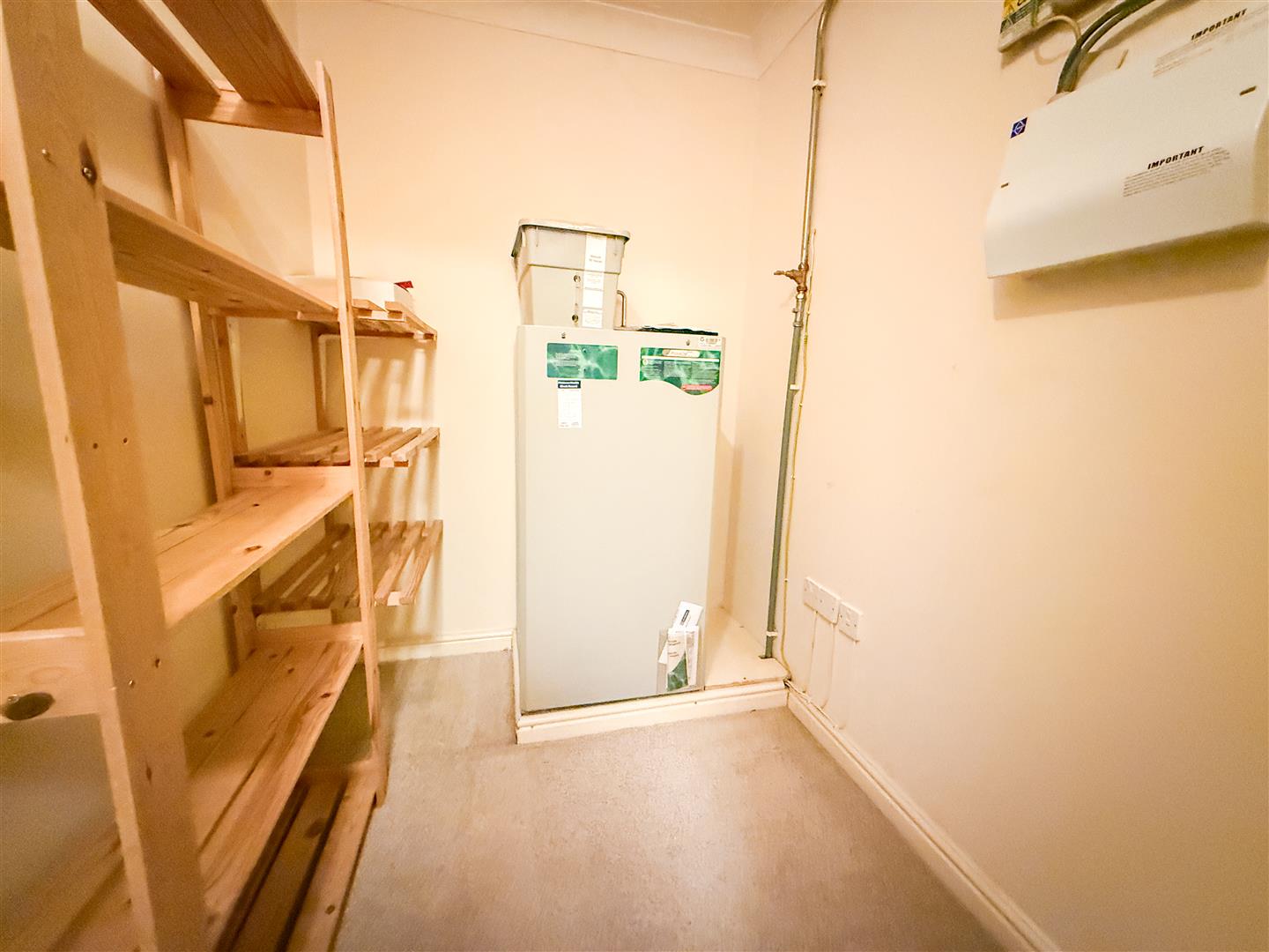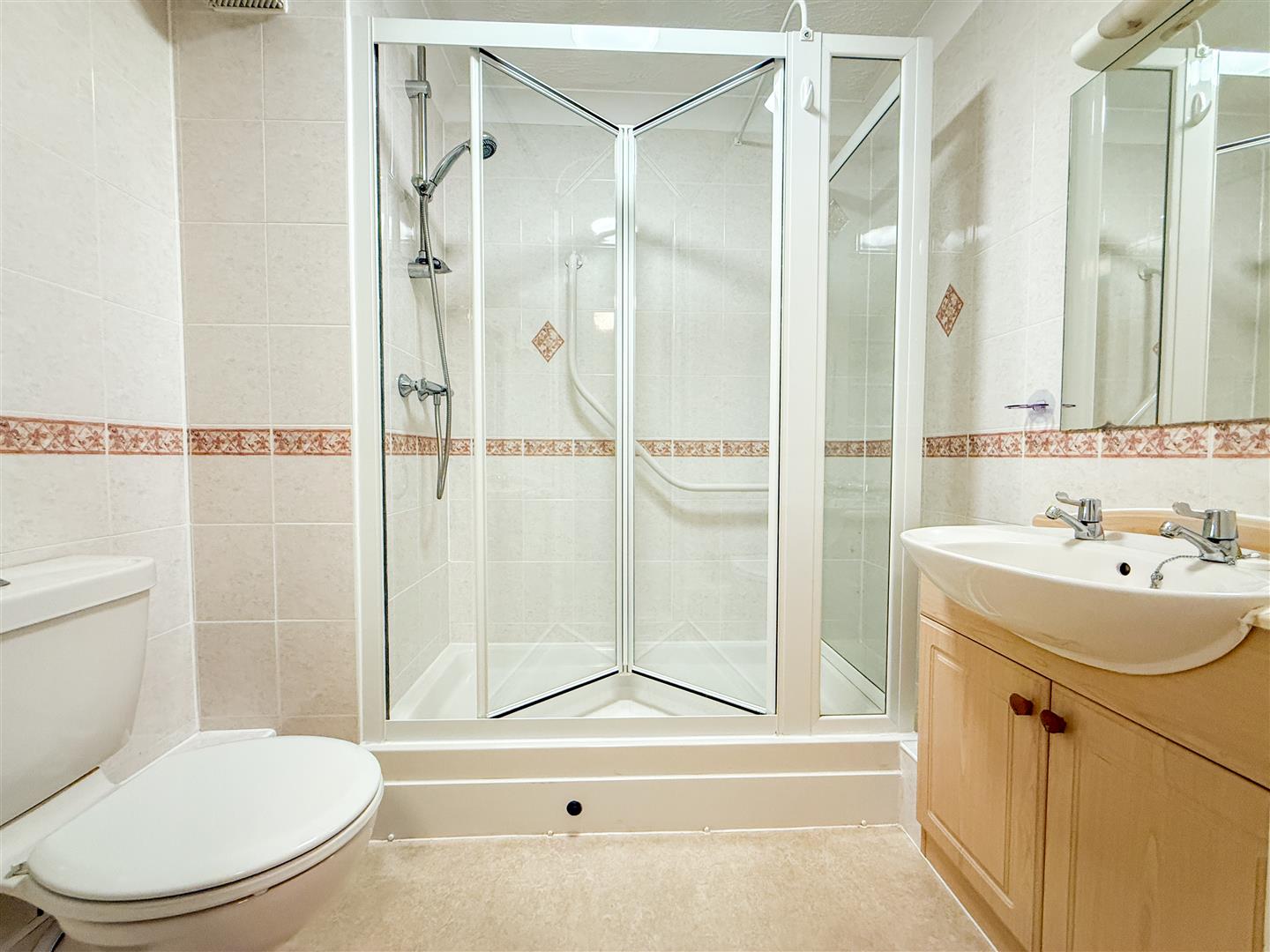 Fitted with a three piece white suite. Comprises low level W.C. Double shower cubicle. Vanity wash hand basin with cupboards below. Electric heated towel rail (not tested), Fully tiled walls. Extractor hood (not tested).