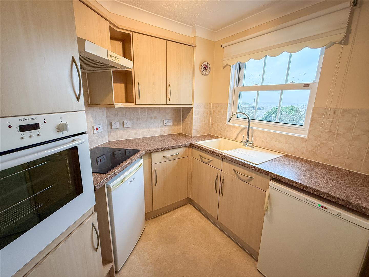 Fitted with a range of birch wood effect fronted units. Comprises laminated rolled edge work surfaces with cupboards and drawers below. Range of matching wall mounted units. Inset single drainer sink unit with mixer tap. Tiled splash backs. Inset four ring electric hob with extractor hood above. Built in high level electric oven.(all appliances not tested). Space for under counter fridge and freezers. Double glazed window to front giving sea views across road.